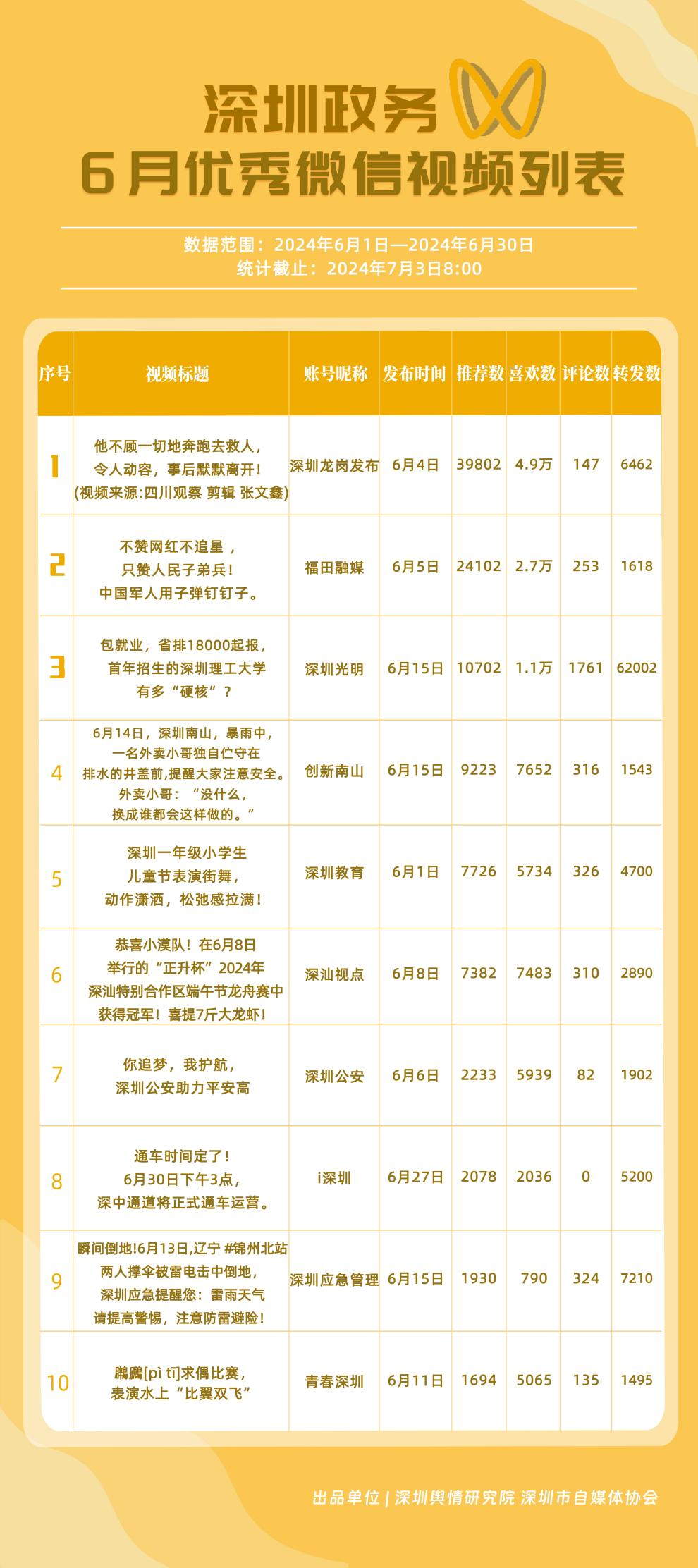 6月,政務(wù)微信視頻號(hào)“深圳光明”“福田融媒”“創(chuàng)新南山”“深圳教育”“深圳龍崗發(fā)布”“深汕觀點(diǎn)”“深圳工會(huì)”“深圳公安”“深圳應(yīng)急管理”和“青春深圳”榮獲“深圳優(yōu)秀政務(wù)微信視頻號(hào)”稱號(hào)。結(jié)合整體數(shù)據(jù)來(lái)看,6月深圳政務(wù)視頻號(hào)平臺(tái)推出多條爆款視頻,如《他不顧一切地奔跑去救人,令人動(dòng)容,事后默默離開(kāi)!》《不贊網(wǎng)紅不追星,只贊人民子弟兵!中國(guó)軍人用子彈釘釘子》等作品,收獲了上萬(wàn)的推薦數(shù)和喜歡數(shù),是政務(wù)信息傳播高效化和正能量傳播機(jī)制的體現(xiàn)。