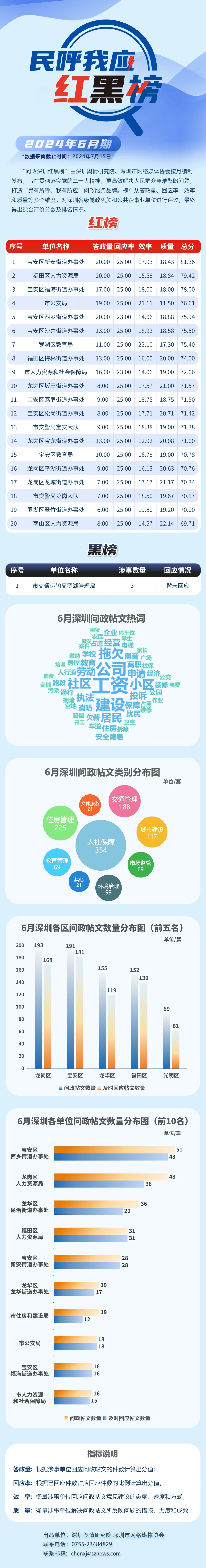 2024年6月,共有20家單位因積極解決民生問題,認真細致答政,登上“紅榜”,它們分別是:寶安區(qū)新安街道辦事處、福田區(qū)人力資源局、寶安區(qū)福海街道辦事處、市公安局、寶安區(qū)西鄉(xiāng)街道辦事處、寶安區(qū)沙井街道辦事處、羅湖區(qū)教育局、福田區(qū)梅林街道辦事處、市人力資源和社會保障局、龍崗區(qū)坂田街道辦事處、寶安區(qū)燕羅街道辦事處、寶安區(qū)松崗街道辦事處、市交警局寶安大隊、龍崗區(qū)寶龍街道辦事處、寶安區(qū)教育局、龍崗區(qū)平湖街道辦事處、龍崗區(qū)龍城街道辦事處、市交警局龍崗大隊、羅湖區(qū)翠竹街道辦事處、南山區(qū)人力資源局。另外,市交通運輸局羅湖管理局因相關帖文回應率偏低,整體答政效果不佳,被列入“黑榜”。