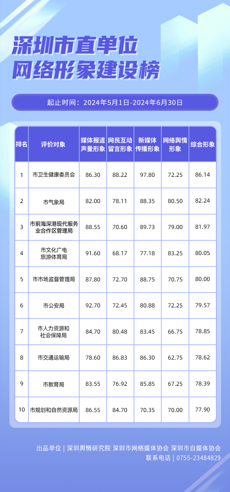 為全面評估深圳各區(qū)各單位網(wǎng)絡(luò)形象建設(shè)情況,助力各區(qū)各單位持續(xù)響應(yīng)居民對美好生活的期許,賦能城市高質(zhì)量發(fā)展,深圳輿情研究院、深圳市網(wǎng)絡(luò)媒體協(xié)會、深圳市自媒體協(xié)會聯(lián)合推出“深圳各區(qū)各單位網(wǎng)絡(luò)形象建設(shè)榜”,從網(wǎng)絡(luò)聚合聲量、留言互動成效、社會生活評價、輿情管理能力及新媒體傳播水平等方面,多維度分析深圳各區(qū)(含大鵬新區(qū)、深汕特別合作區(qū))、各市直單位(市直屬單位、直屬部門)的網(wǎng)絡(luò)形象建設(shè)成果,凸顯各區(qū)各單位的“共性”與“個性”。