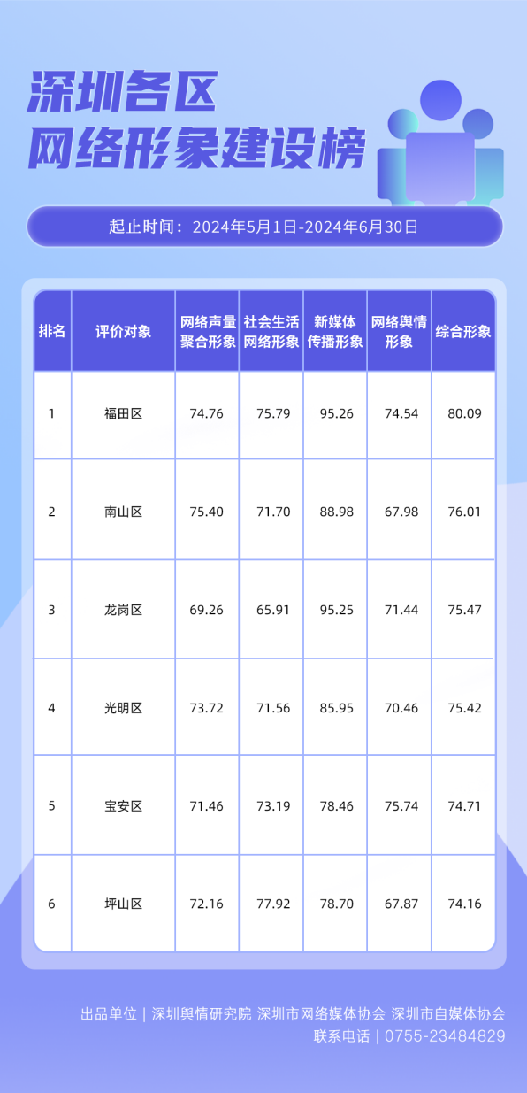 5-6月,在《深圳各區(qū)新媒體傳播形象榜》中,福田區(qū)、龍崗區(qū)、南山區(qū)、龍華區(qū)、光明區(qū)、坪山區(qū)均展現(xiàn)了出色的表現(xiàn),成功躋身榜單前六強。其中福田區(qū)、龍崗區(qū)超過95分的高分表現(xiàn)尤為搶眼,反映出兩區(qū)在新媒體傳播上的深度投入和創(chuàng)新實踐。南山區(qū)則以88.98分的成績,榮獲榜單第三名,顯示出其在提升新媒體傳播能力方面的不懈努力。龍華區(qū)、光明區(qū)和坪山區(qū)緊隨其后,分別位列第四至第六名,表明這些區(qū)域同樣在新媒體傳播領(lǐng)域不斷探索和深化工作,尋求創(chuàng)新的方式來提升自身的新媒體形象。整體來看,上榜區(qū)域的新媒體傳播工作不僅提升了信息傳播效率,也為塑造深圳各區(qū)的正面形象做出了積極貢獻。