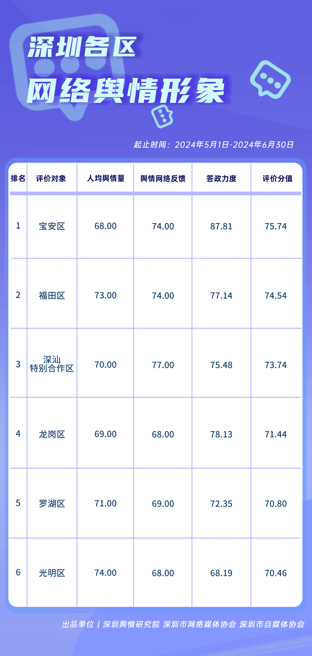 在《深圳各區(qū)網(wǎng)絡(luò)輿情形象榜》中,寶安區(qū)以75.74分的高分榮登榜首,其在答政力度上的表現(xiàn)尤為突出,得分高達87.81分,這充分展現(xiàn)了寶安區(qū)對網(wǎng)絡(luò)問政工作的重視程度。緊隨其后的是福田區(qū),以74.54分的評價分值位列第二。福田區(qū)在輿情處置相關(guān)的多個評價指標上均表現(xiàn)出色,每項指標得分均超過73分。深汕特別合作區(qū)、龍崗區(qū)、羅湖區(qū)和光明區(qū)則分別位列第三至第六名。這些區(qū)域同樣展現(xiàn)出對民眾聲音的高度重視,將民意視為改進工作的重要參考,并且積極采取措施主動回應(yīng)民眾關(guān)切,體現(xiàn)了其在網(wǎng)絡(luò)輿情管理上的積極態(tài)度和有效策略。