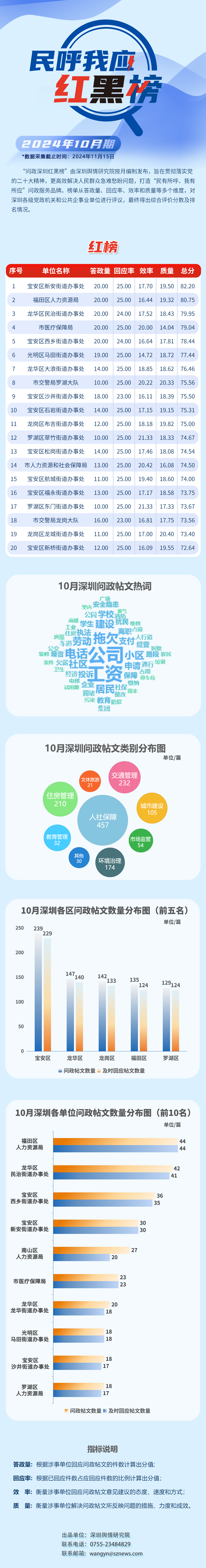 “深圳民呼我應(yīng)紅黑榜”由深圳輿情研究院按月編制發(fā)布,旨在貫徹落實(shí)黨的二十大精神,更高效解決人民群眾急難愁盼問(wèn)題,打造“民有所呼、我有所應(yīng)”問(wèn)政服務(wù)品牌。榜單從答政量、回應(yīng)率、效率和質(zhì)量等多個(gè)維度對(duì)深圳各級(jí)黨政機(jī)關(guān)和公共企事業(yè)單位進(jìn)行評(píng)議,最終得出綜合評(píng)價(jià)分?jǐn)?shù)及排名情況。