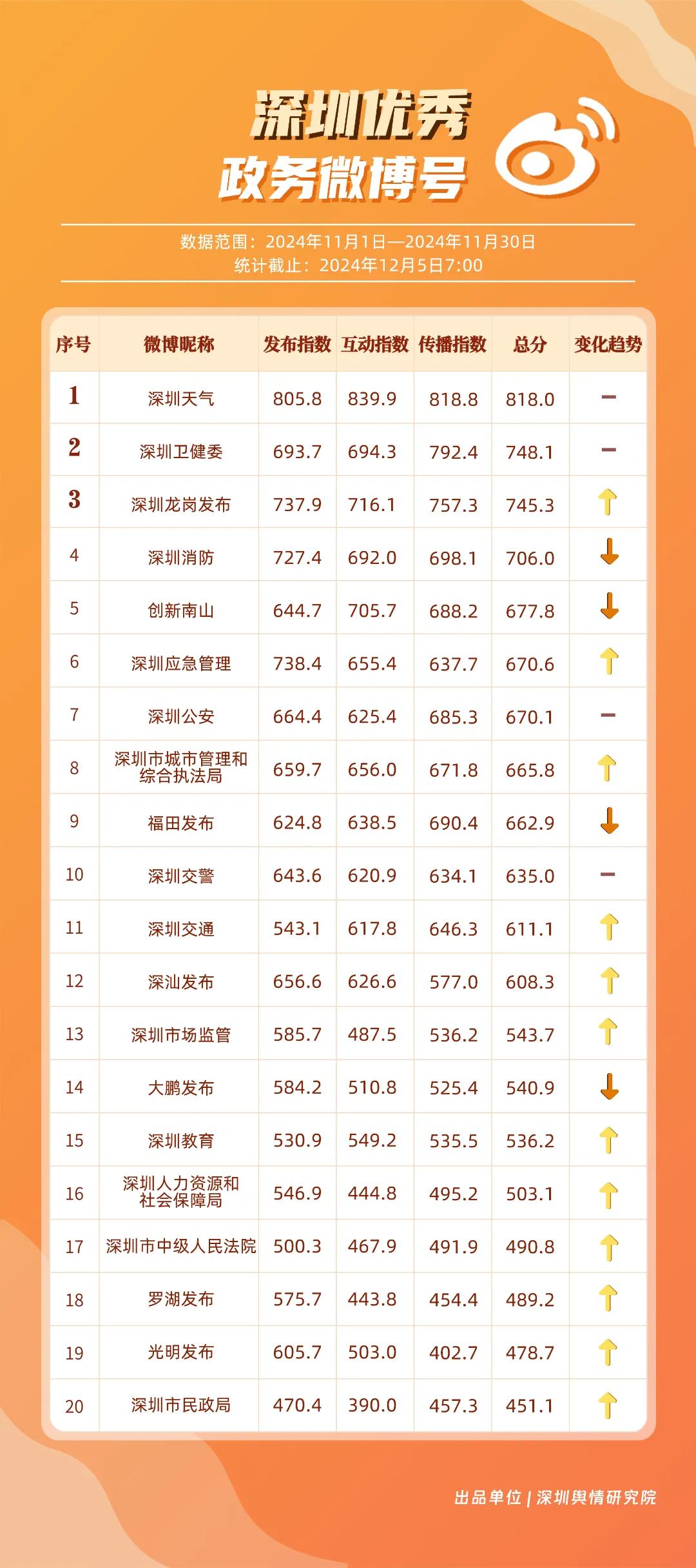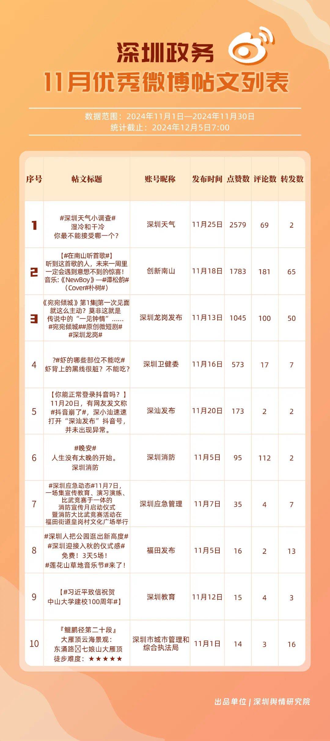11月,“深圳天氣”“深圳衛(wèi)健委”“深圳龍崗發(fā)布”“深圳消防”“創(chuàng)新南山”“深圳應(yīng)急管理”“深圳公安”“深圳市城市管理和綜合執(zhí)法局”“福田發(fā)布”“深圳交警”等20個賬號入選“優(yōu)秀政務(wù)微博號”。“深圳天氣”“深圳衛(wèi)健委”賬號在信息傳播上不斷精進,為市民帶來及時、優(yōu)質(zhì)且高效的資訊,內(nèi)容緊貼民生,贏得了市民的廣泛贊譽,排名穩(wěn)定在前2名。同時,“深圳龍崗發(fā)布”“深圳消防”和“創(chuàng)新南山”等賬號也能夠精準滿足市民的信息需求,并在此基礎(chǔ)上提升市民閱讀體驗,推動了其在榜單上的穩(wěn)步提升,彰顯了政務(wù)微博的創(chuàng)新活力與社會價值。