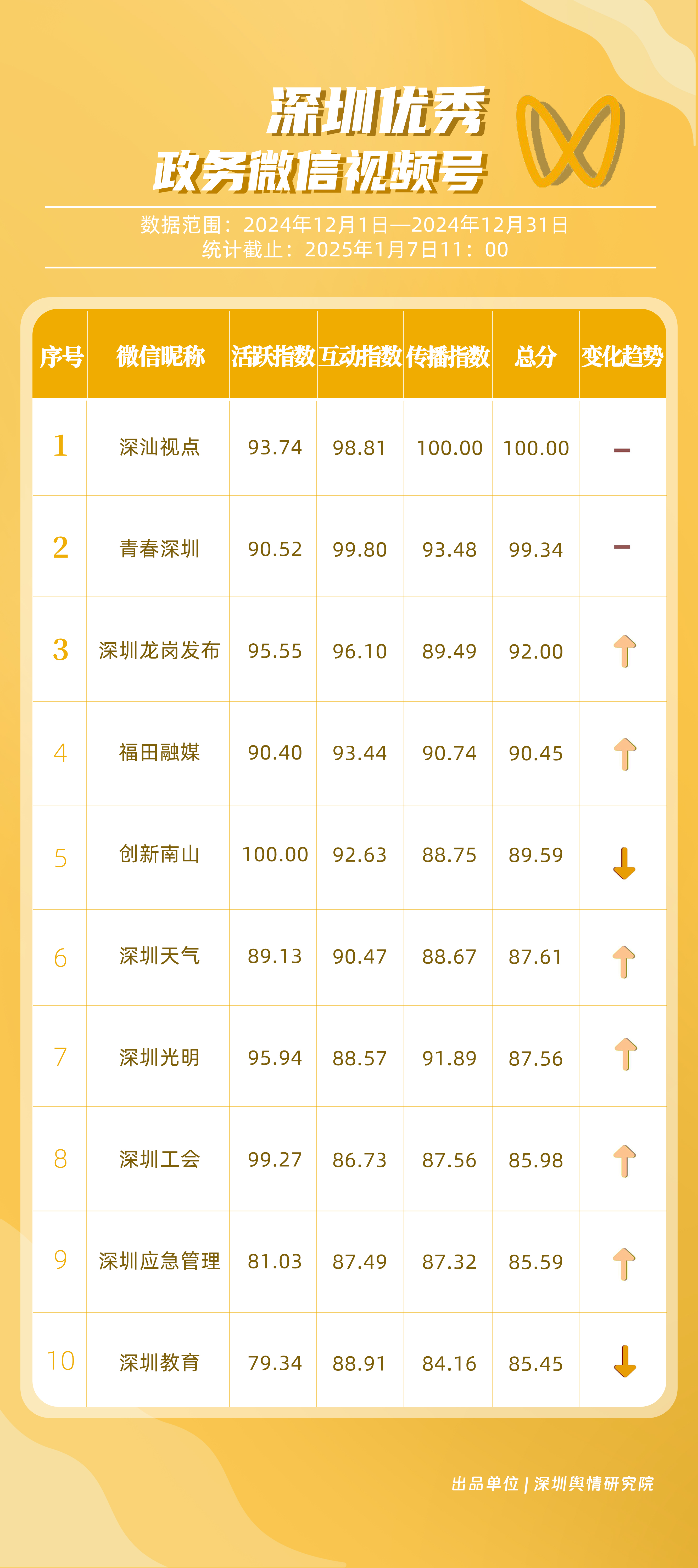 12月,獲“深圳優(yōu)秀政務(wù)微信視頻號(hào)”稱號(hào)的分別是“深汕視點(diǎn)”“青春深圳”“深圳龍崗發(fā)布”“福田融媒”“創(chuàng)新南山”“深圳天氣”“深圳光明”“深圳工會(huì)”“深圳應(yīng)急管理”“深圳教育”。其中,“深汕視點(diǎn)”“青春深圳”在互動(dòng)方面表現(xiàn)突出,占據(jù)榜單第一、第二位置。“深圳龍崗發(fā)布”活躍、互動(dòng)指數(shù)位于各政務(wù)視頻號(hào)前列,排名有所提升?!案L锶诿健比笾笜?biāo)得分均在90分以上,位于榜單第四名,充分展現(xiàn)各政務(wù)微信視頻號(hào)在信息更新、用戶互動(dòng)以及傳播范圍等方面的卓越能力和持續(xù)進(jìn)步。