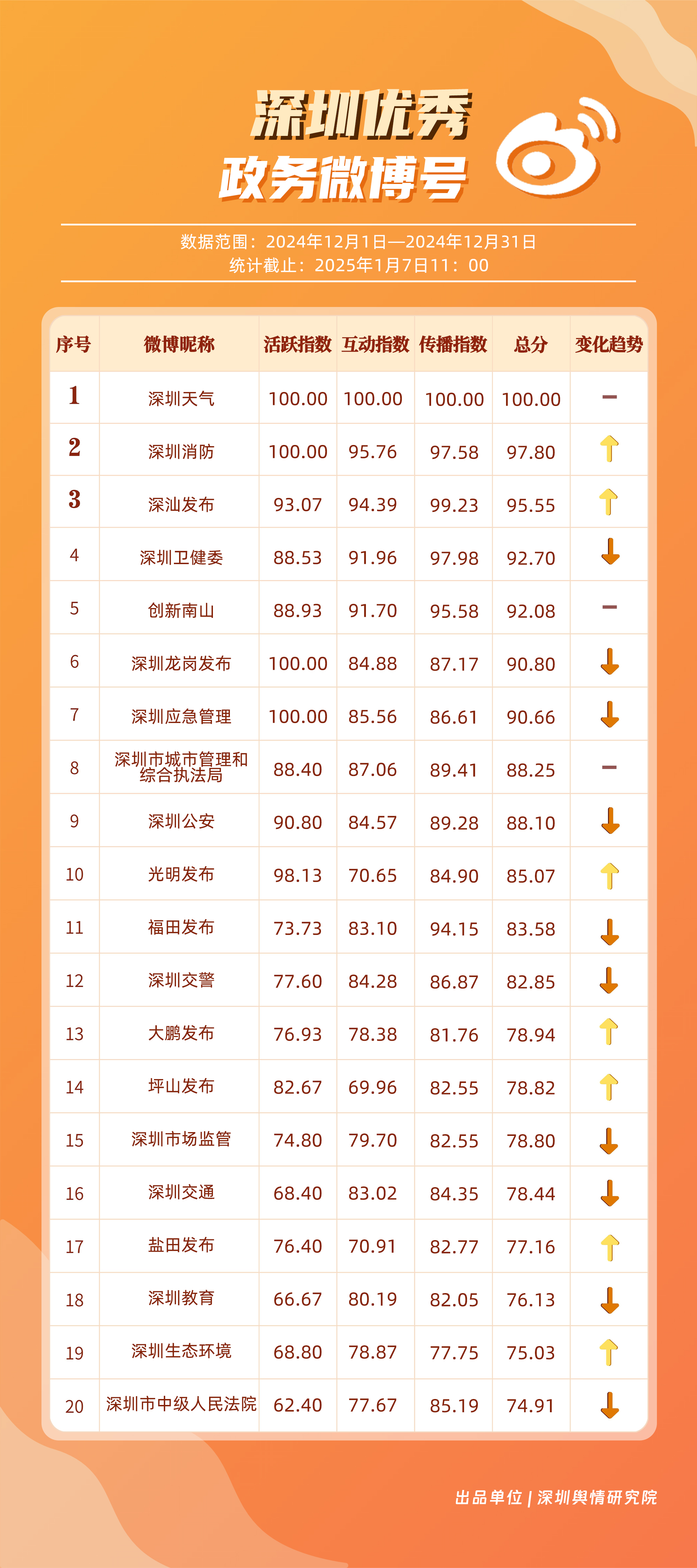 12月,“深圳天氣”“深圳消防”“深汕發(fā)布”“深圳衛(wèi)健委”“創(chuàng)新南山”“深圳龍崗發(fā)布”“深圳應(yīng)急管理”“深圳市城市管理和綜合執(zhí)法局”“深圳公安”“光明發(fā)布”等20個(gè)賬號(hào)入選“優(yōu)秀政務(wù)微博號(hào)”?!吧钲谔鞖狻鲍@得滿分,“深圳消防”“深汕發(fā)布”賬號(hào)總分均超95分,位于榜單前三名。同時(shí),“深圳衛(wèi)健委”“創(chuàng)新南山”“深圳龍崗發(fā)布”及“深圳應(yīng)急管理”等賬號(hào)憑借對(duì)熱點(diǎn)的敏銳捕捉與信息的及時(shí)發(fā)布,總分在90分以上,體現(xiàn)出各自在提升公眾信息獲取質(zhì)量方面的不懈努力,彰顯了政務(wù)微博賬號(hào)在政民連接、信息共享等方面的巨大價(jià)值。