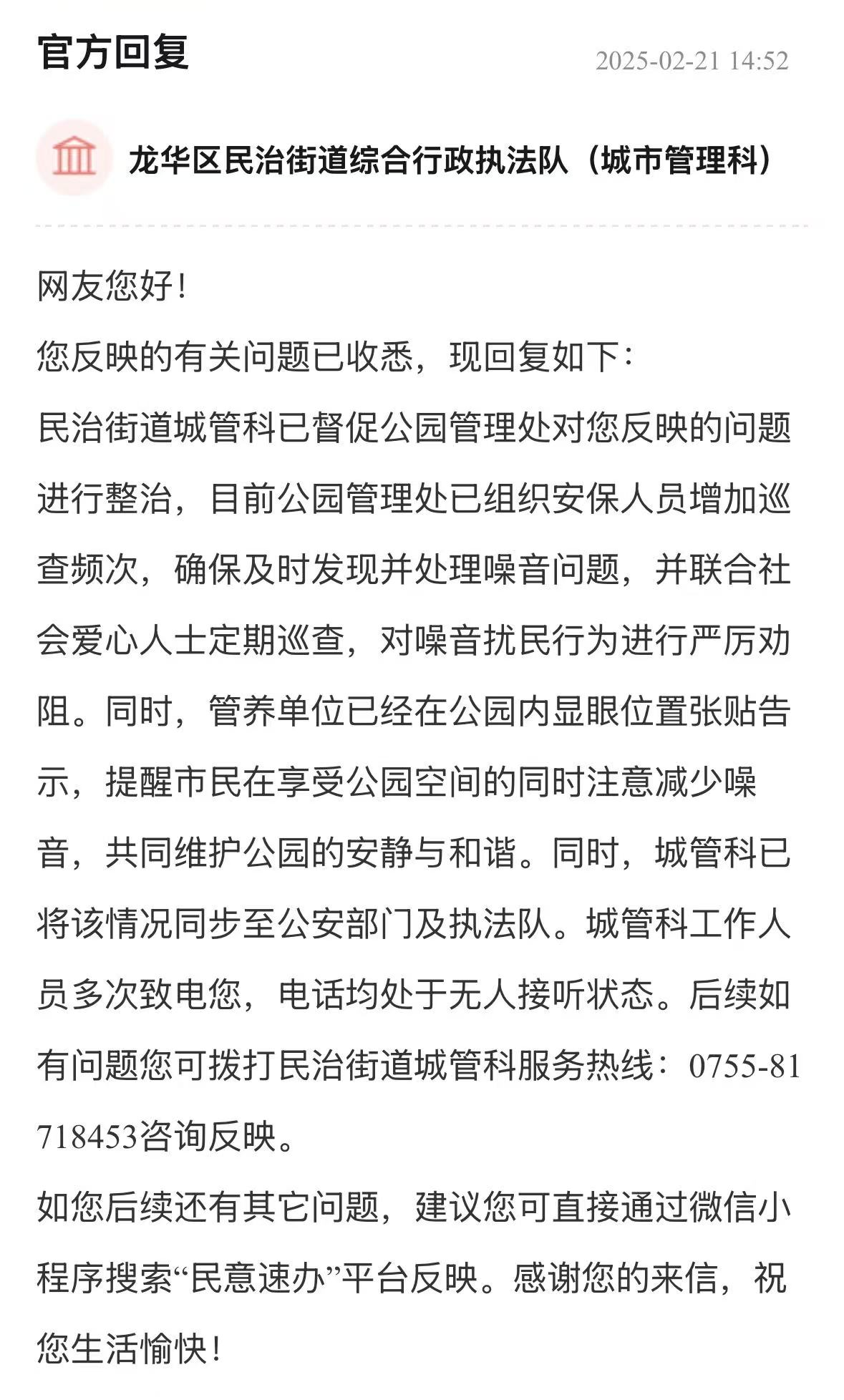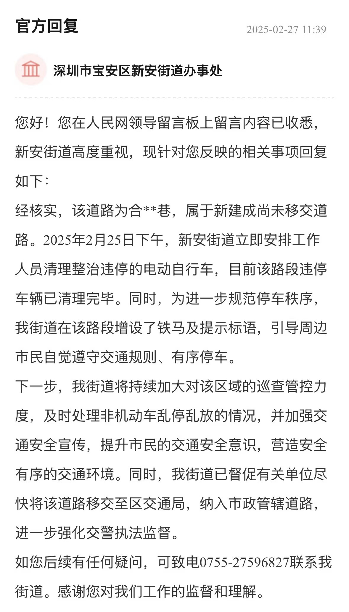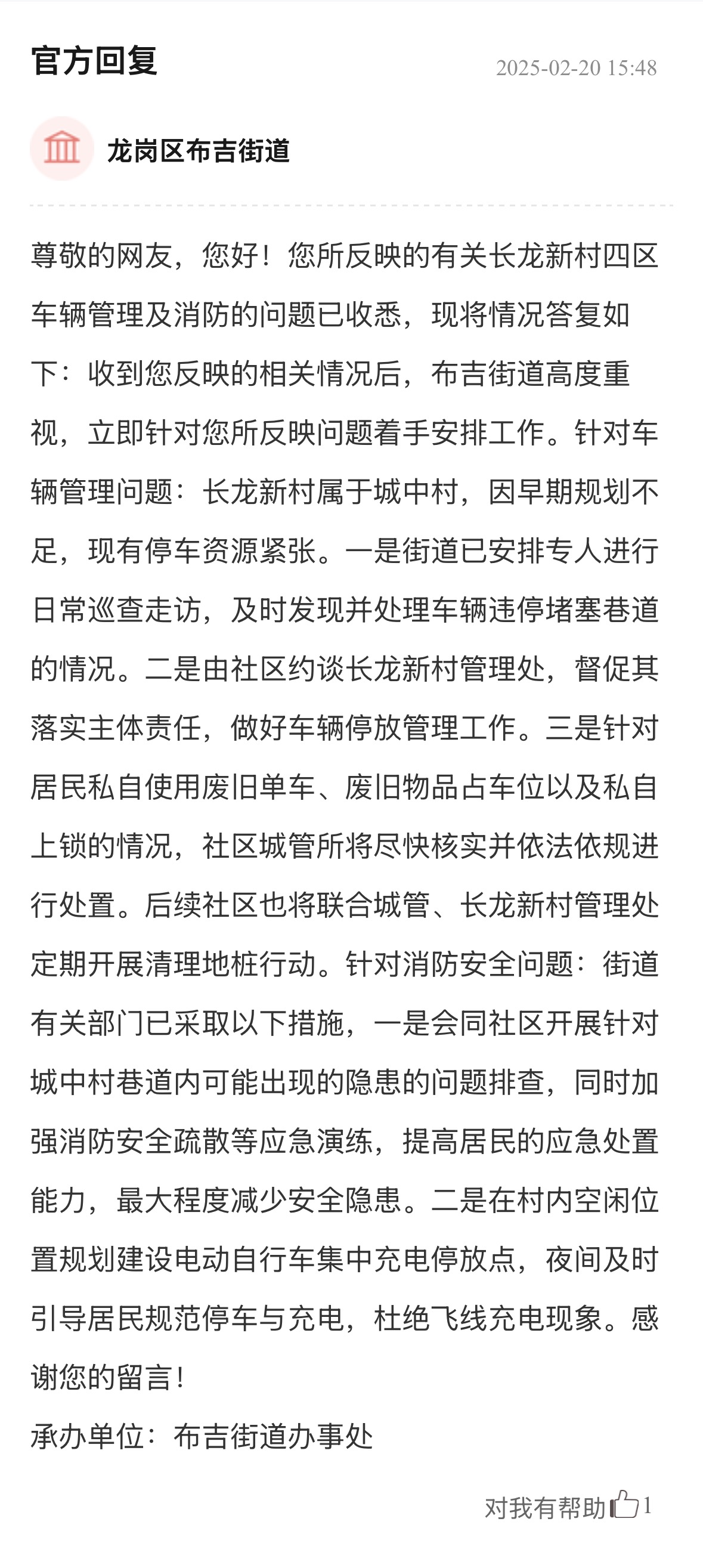 案例點(diǎn)評(píng):街道辦針對(duì)車輛管理、消防問題多管齊下,旨在營造一個(gè)通暢、安全的出行和生活環(huán)境,態(tài)度值得肯定。回應(yīng)展示了街道辦構(gòu)建的“專項(xiàng)巡查+設(shè)施建設(shè)+行為引導(dǎo)”綜合治理體系,精準(zhǔn)直擊問題核心,兼顧當(dāng)下整治與長遠(yuǎn)規(guī)劃,切實(shí)保障居民居住和生活安全,其系統(tǒng)性解決思路對(duì)同類區(qū)域治理具有重要參考價(jià)值。
