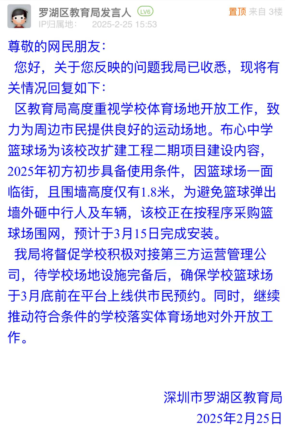 案例點(diǎn)評(píng):市民關(guān)注布心中學(xué)籃球場(chǎng)開放時(shí)間,反映出對(duì)公共運(yùn)動(dòng)空間的迫切需求。羅湖區(qū)教育局詳細(xì)說明場(chǎng)地未開放原因及施工節(jié)點(diǎn),并明確后續(xù)開放計(jì)劃,有效化解群眾疑慮,有助于“全民健身”政策更好落地。