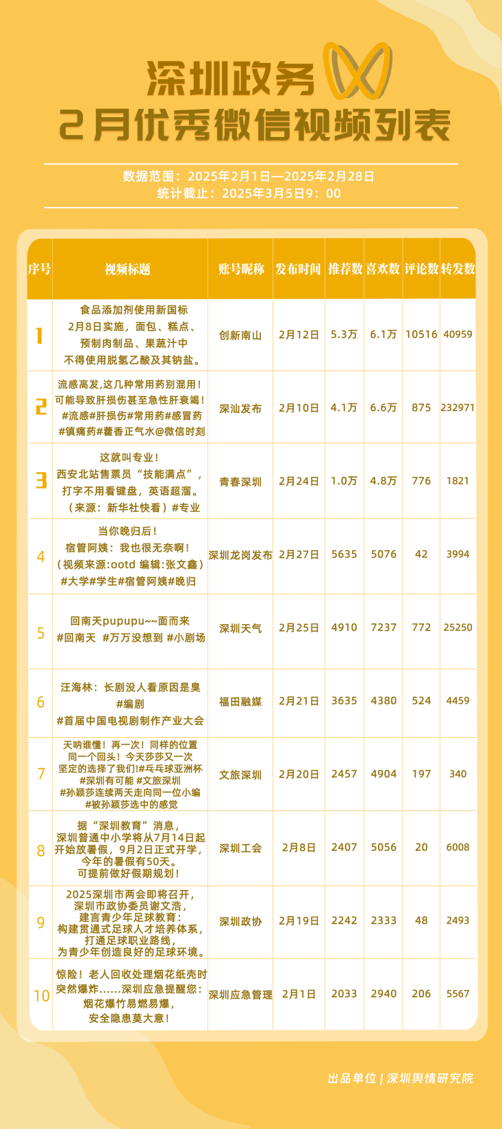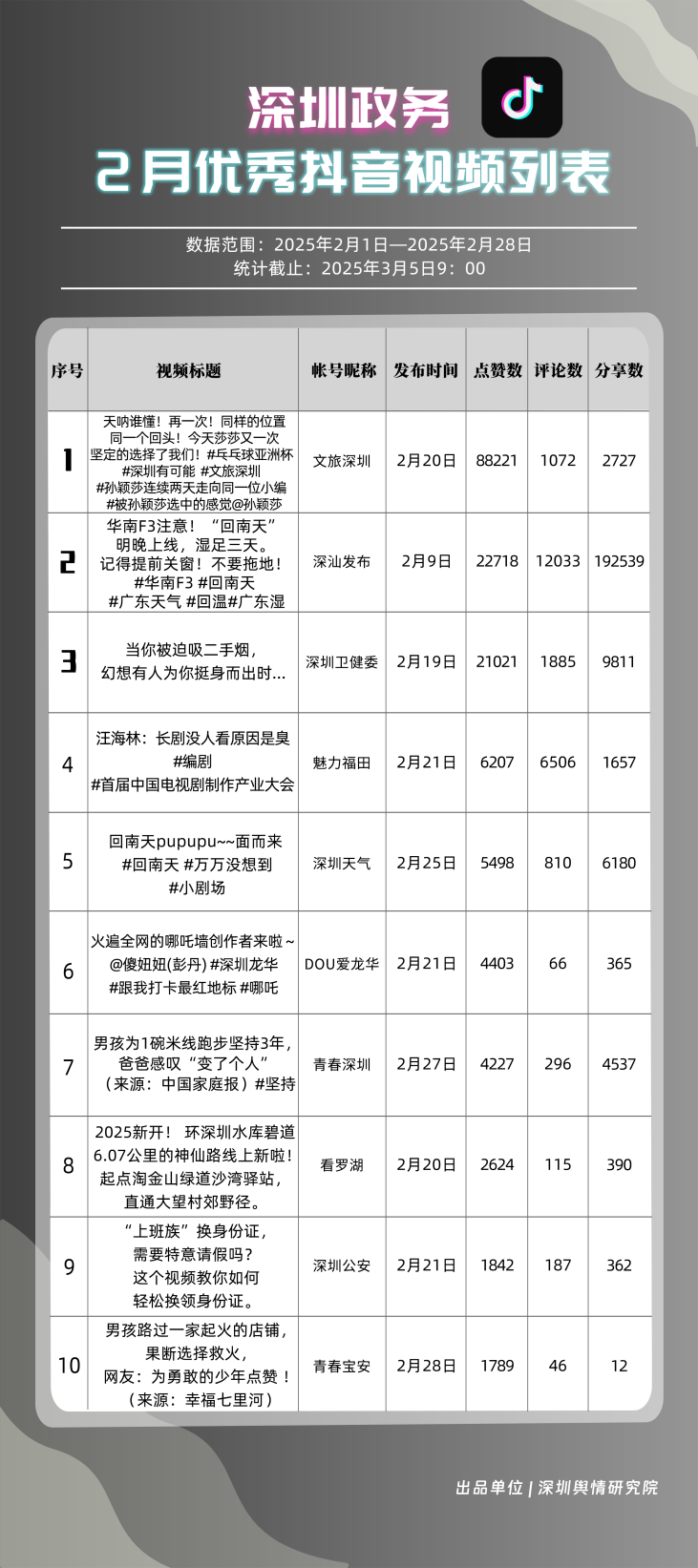 2月,“深汕發(fā)布”“深圳天氣”“魅力福田”“深圳衛(wèi)健委”“文旅深圳”“掌上龍崗”“青春深圳”“DOU愛龍華”“深圳工會”“深圳公安”共10個政務(wù)抖音號獲得“深圳優(yōu)秀政務(wù)抖音號”稱號?!吧钌前l(fā)布”位于榜單第一名,值得關(guān)注的是,該賬號2月作品總分享數(shù)超20萬次,其中有關(guān)“華南地區(qū)回南天”的視頻單條分享量達到19萬次以上,展現(xiàn)出強勁的傳播力?!吧钲谔鞖狻薄镑攘ΩL铩薄吧钲谛l(wèi)健委”三賬號堅持輸出優(yōu)質(zhì)內(nèi)容,得分均在94分以上,展現(xiàn)出深圳政務(wù)新媒體賬號在短視頻傳播領(lǐng)域的創(chuàng)新活力。