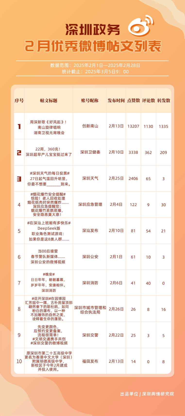 2月,“深圳天氣”“創(chuàng)新南山”“深圳衛(wèi)健委”“深圳消防”“深圳應(yīng)急管理”“福田發(fā)布”“深圳公安”“深汕發(fā)布”“深圳龍崗發(fā)布”“深圳交警”等20個賬號入選“優(yōu)秀政務(wù)微博號”。綜合看來,本月榜單前10名較上期變動不大,反映出靠前賬號運營發(fā)揮較穩(wěn)定。其中,“深圳天氣”在榜單中獲得第一名,該賬號與網(wǎng)民互動積極,2月作品總點贊數(shù)超8萬次;“創(chuàng)新南山”“深圳衛(wèi)健委”“深圳消防”“深圳應(yīng)急管理”也各有所長,排名靠前,展現(xiàn)出深圳政務(wù)微博在形象塑造、民生服務(wù)、應(yīng)急科普等領(lǐng)域的持續(xù)影響力。