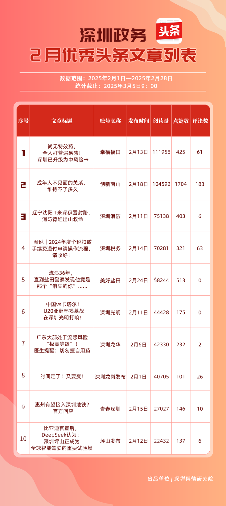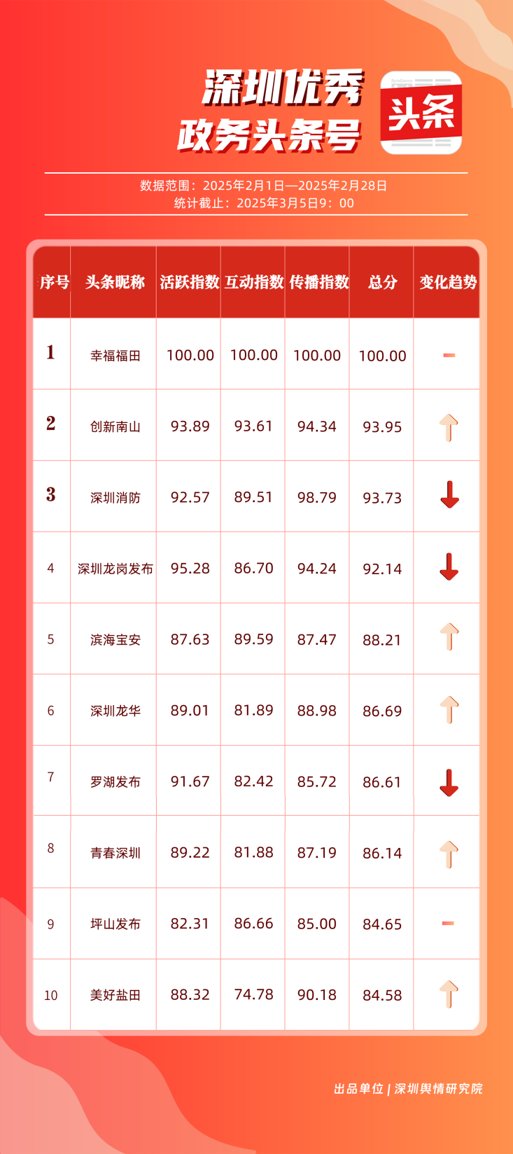 2月,“幸福福田”“創(chuàng)新南山”“深圳消防”“深圳龍崗發(fā)布”“濱海寶安”“深圳龍華”“羅湖發(fā)布”“青春深圳”“坪山發(fā)布”“美好鹽田”共10個政務(wù)頭條號入選“優(yōu)秀政務(wù)頭條號”榜單?!靶腋8L铩?月今日頭條作品總閱讀數(shù)超60萬,綜合實力較強,多次位居頭條平臺榜單第一?!皠?chuàng)新南山”“深圳消防”“深圳龍崗發(fā)布”總分均在90分以上,展現(xiàn)出深圳政務(wù)頭條號的持續(xù)影響力,為其他政務(wù)賬號提供了可借鑒的運營范例。