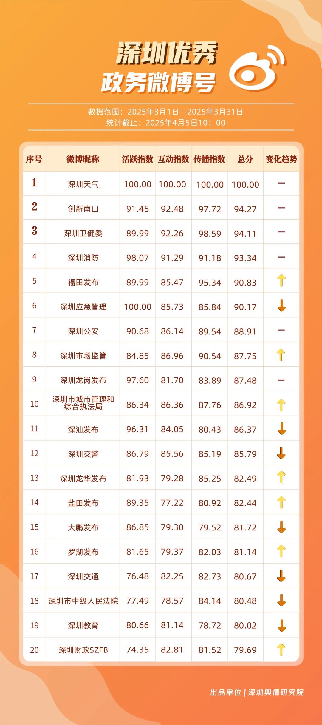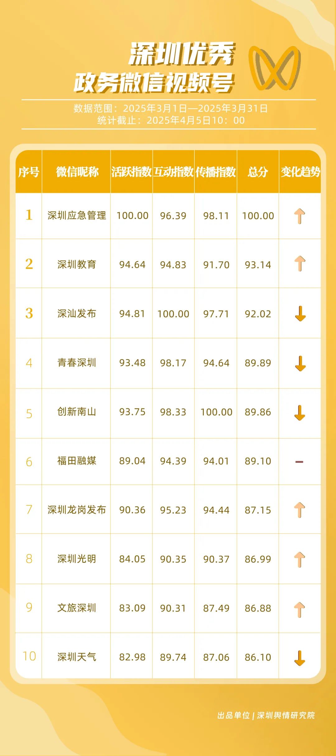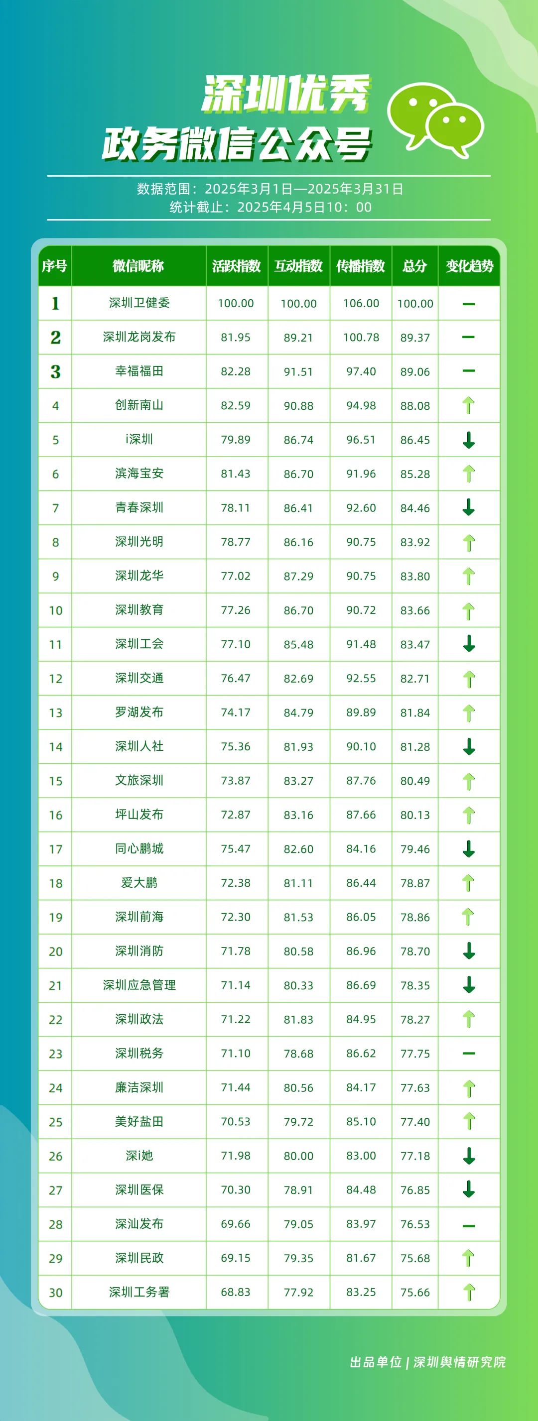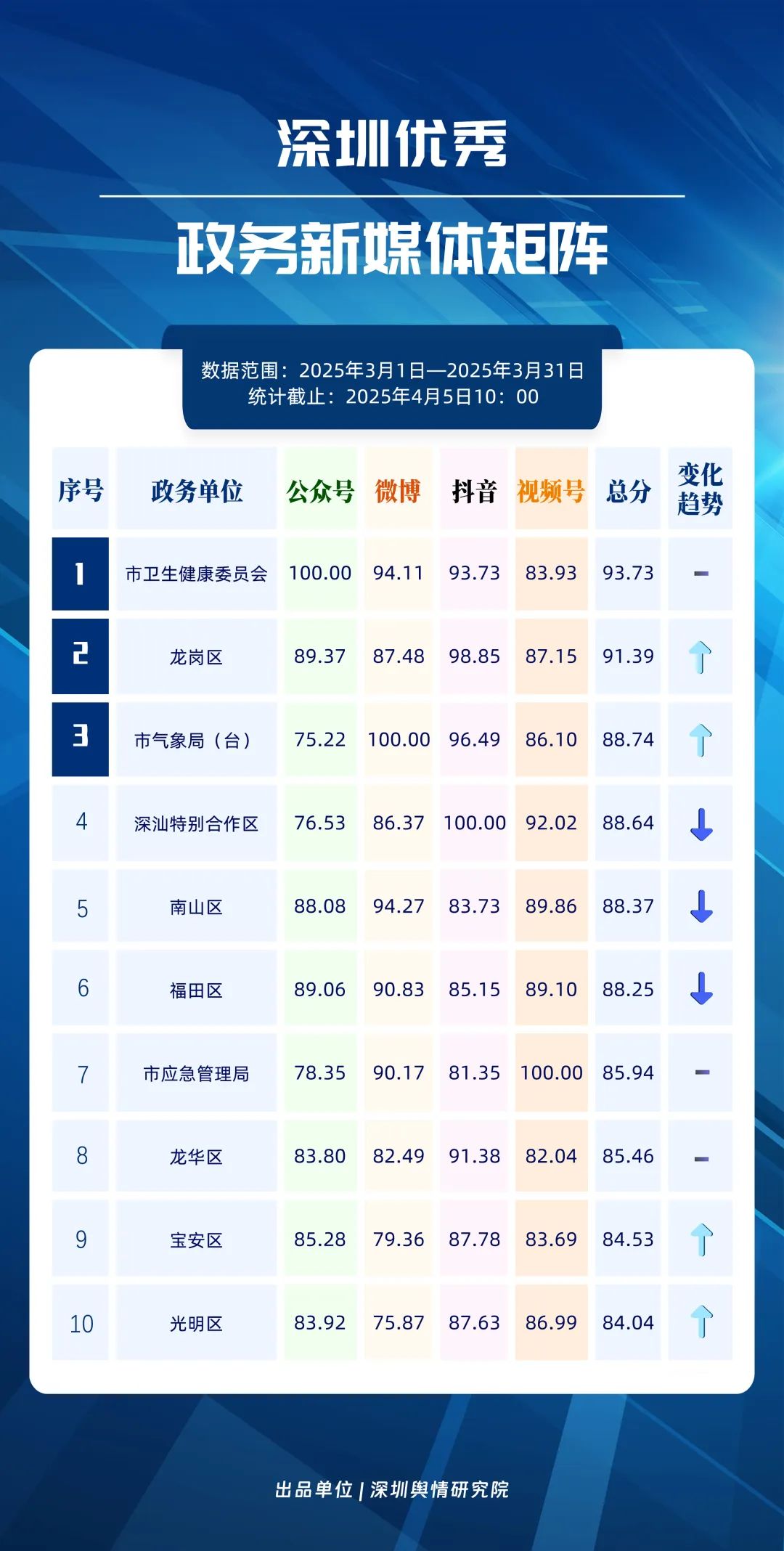 3月,市衛(wèi)生健康委、龍崗區(qū)、市氣象局、深汕特別合作區(qū)、南山區(qū)、福田區(qū)、市應(yīng)急管理局、龍華區(qū)、寶安區(qū)、光明區(qū)榮登“深圳優(yōu)秀政務(wù)新媒體矩陣”榜單。3月,市衛(wèi)生健康委新媒體矩陣持續(xù)關(guān)注市民身心健康,發(fā)布健康科普內(nèi)容,穩(wěn)居榜單第一位;龍崗區(qū)新媒體矩陣在抖音、微信視頻號平臺發(fā)力宣傳,躍居榜單第二位;市氣象局新媒體矩陣在微博平臺連續(xù)多期獲得滿分,持續(xù)以氣象預(yù)警與生活指南結(jié)合的內(nèi)容模式,為市民帶來便利信息。以上賬號在“深圳優(yōu)秀政務(wù)新媒體矩陣”榜單中榮獲前三名。此外,深汕特別合作區(qū)新媒體矩陣積極發(fā)布網(wǎng)絡(luò)熱點內(nèi)容,收獲較多網(wǎng)民關(guān)注分享;南山區(qū)新媒體矩陣多平臺實力強勁,以88.37分居于榜單第五位。值得關(guān)注的是,寶安區(qū)新媒體矩陣時隔多期躋身榜單前十名,多平臺均衡發(fā)展成效初顯。