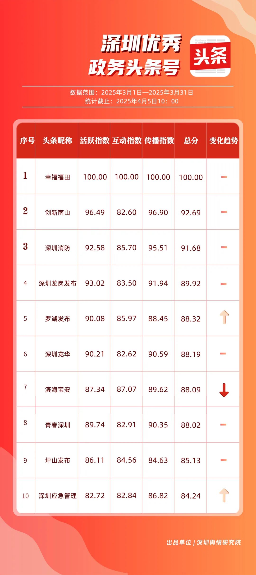 3月,“幸福福田”“創(chuàng)新南山”“深圳消防”“深圳龍崗發(fā)布”“羅湖發(fā)布”“深圳龍華”“濱海寶安”“青春深圳”“坪山發(fā)布”“深圳應(yīng)急管理”共10個政務(wù)頭條號入選“優(yōu)秀政務(wù)頭條號”榜單。上榜賬號中,“幸福福田”“創(chuàng)新南山”“深圳消防”“深圳龍崗發(fā)布”在頭條平臺排名較為穩(wěn)固,排名未產(chǎn)生變動。當(dāng)月,“深圳應(yīng)急管理”以84.24分躋身榜單前十。
