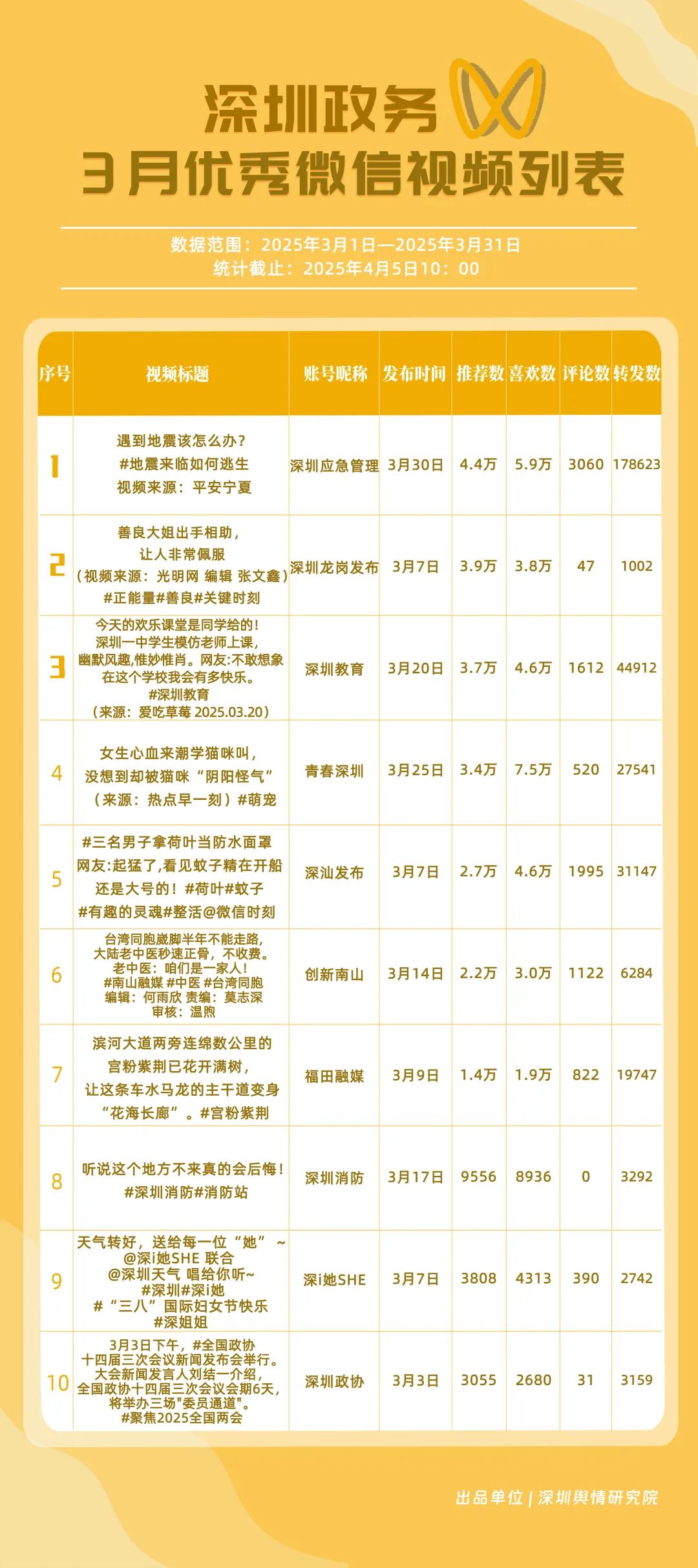 3月,獲“深圳優(yōu)秀政務(wù)微信視頻號”稱號的分別是“深圳應(yīng)急管理”“深圳教育”“深汕發(fā)布”“青春深圳”“創(chuàng)新南山”“福田融媒”“深圳龍崗發(fā)布”“深圳光明”“文旅深圳”“深圳天氣”。其中,“深圳應(yīng)急管理”以20余篇作品收獲超20萬次轉(zhuǎn)發(fā),躍居第一名,一期有關(guān)“地震來臨如何逃生”的視頻收獲超17萬次轉(zhuǎn)發(fā),展現(xiàn)了其內(nèi)容的高實用性?!吧钲诮逃薄吧钌前l(fā)布”位于榜單第二、三位,總分超90分,反映出兩賬號在民生教育、區(qū)域宣傳領(lǐng)域擁有較好傳播效果。“青春深圳”“創(chuàng)新南山”“福田融媒”等賬號也在3月發(fā)布優(yōu)質(zhì)視頻內(nèi)容,展現(xiàn)了深圳政務(wù)新媒體在視頻號平臺宣傳的創(chuàng)新探索。