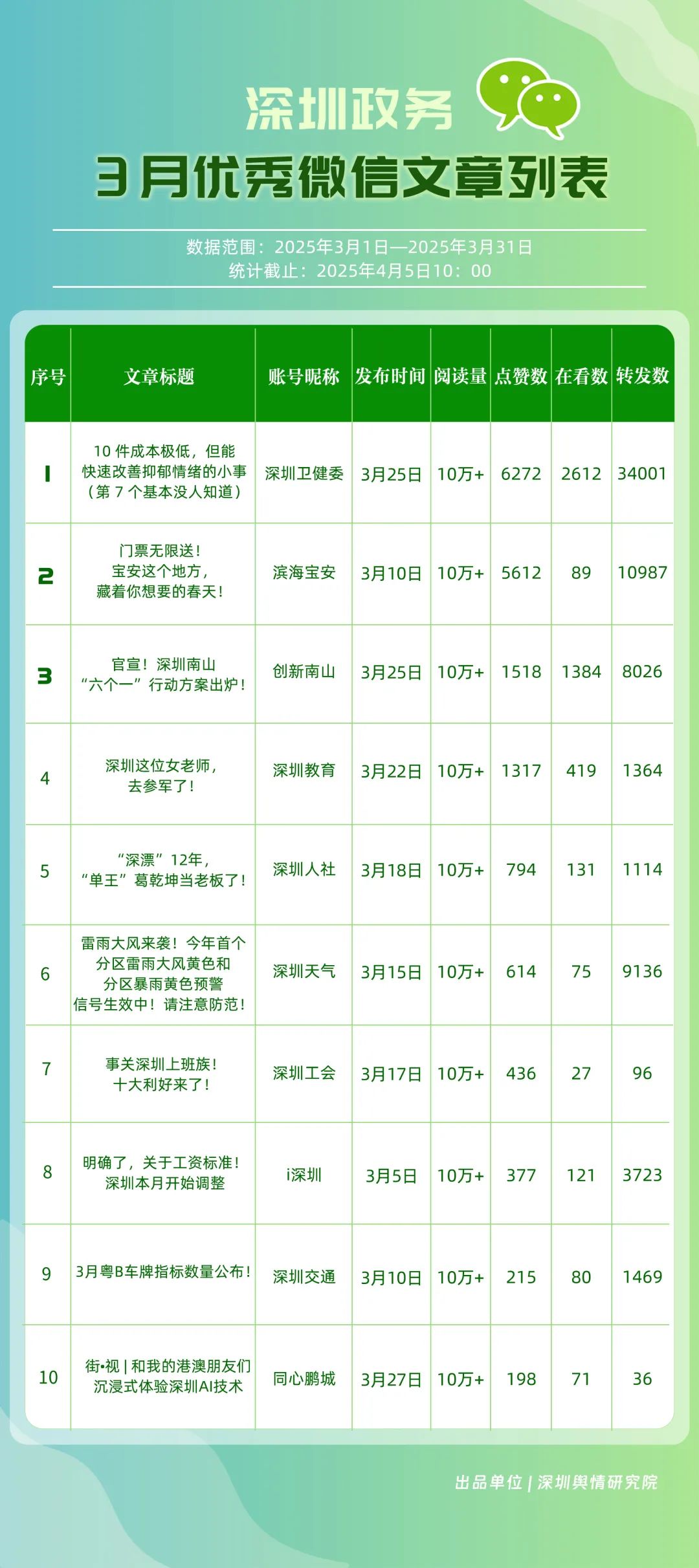 3月,包括“深圳衛(wèi)健委”“深圳龍崗發(fā)布”“幸福福田”“創(chuàng)新南山”“i深圳”“濱海寶安”“青春深圳”“深圳光明”“深圳龍華”“深圳教育”等在內(nèi)的30個賬號入選“深圳優(yōu)秀政務(wù)微信公眾號”。其中,“深圳衛(wèi)健委”超70篇文章閱讀量達(dá)10萬次以上,穩(wěn)居榜單首位;“深圳龍崗發(fā)布”也取得較好傳播效果,在3月產(chǎn)出10余篇閱讀量超10萬次的熱門文章,位于榜單第二位;“幸福福田”也積極發(fā)布高質(zhì)量內(nèi)容,穩(wěn)住榜單第三位置;緊隨其后的是“創(chuàng)新南山”“i深圳”“濱海寶安”,總分均在85分以上。這充分展現(xiàn)了深圳新媒體傳播生態(tài)體系中,各主體的傳播優(yōu)勢與影響力版圖正逐漸凸顯。
