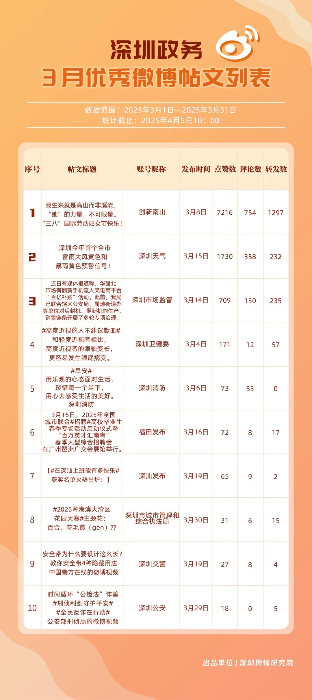 3月,“深圳天氣”“創(chuàng)新南山”“深圳衛(wèi)健委”“深圳消防”“福田發(fā)布”“深圳應(yīng)急管理”“深圳公安”“深圳市場監(jiān)管”“深圳龍崗發(fā)布”“深圳市城市管理和綜合執(zhí)法局”等20個賬號入選“優(yōu)秀政務(wù)微博號”。值得一提的是,“深圳天氣”賬號在3月共獲得點贊超11萬,相較其他賬號具備顯著優(yōu)勢?!皠?chuàng)新南山”“深圳衛(wèi)健委”“深圳消防”也位列前茅,分差微小,競爭激烈。從領(lǐng)域分布來看,上榜賬號不僅包括區(qū)級賬號,還涵蓋民生服務(wù)、應(yīng)急科普、城市治理等單位賬號,體現(xiàn)了深圳政務(wù)新媒體在多領(lǐng)域的強大影響力。