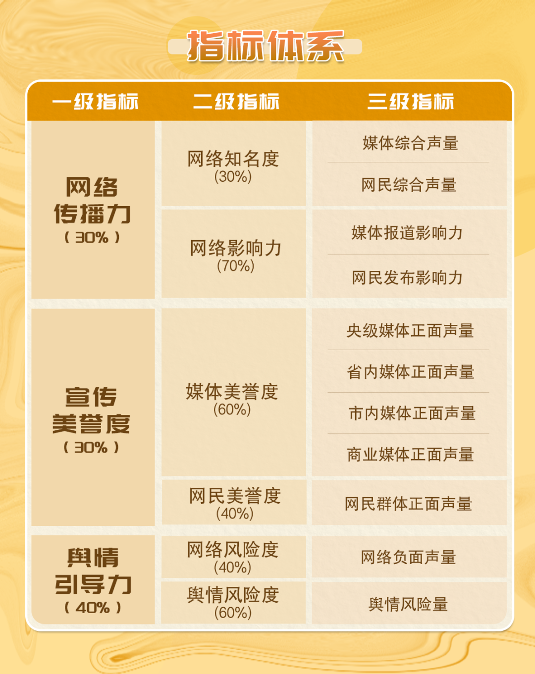 《深圳各街道網(wǎng)絡(luò)形象及影響力榜》具有科學(xué)、可信、量化的指標(biāo)評(píng)價(jià)體系,能夠全面客觀地評(píng)估各街道的網(wǎng)絡(luò)綜合形象及影響力值。具體指標(biāo)體系如下圖所示↓