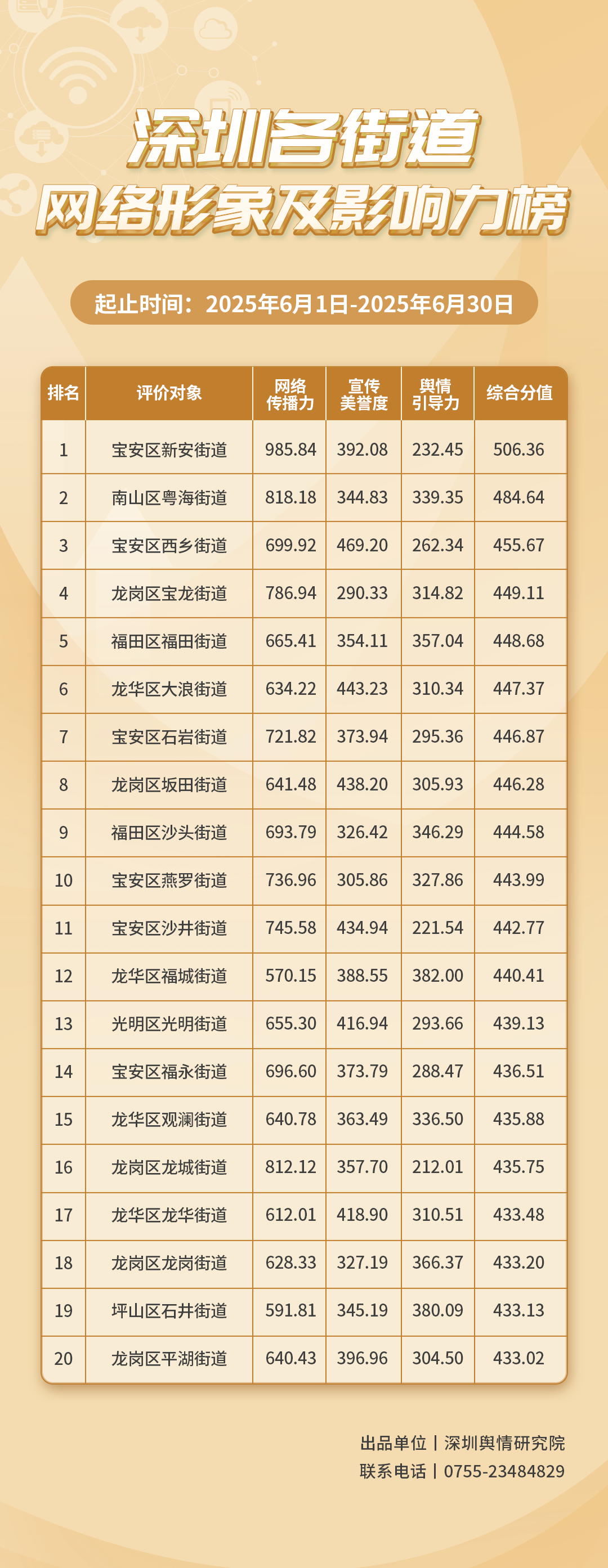 2025年6月,共有20個(gè)街道登上《深圳各街道網(wǎng)絡(luò)形象及影響力榜》,分別是:寶安區(qū)新安街道、南山區(qū)粵海街道、寶安區(qū)西鄉(xiāng)街道、龍崗區(qū)寶龍街道、福田區(qū)福田街道、龍華區(qū)大浪街道、寶安區(qū)石巖街道、龍崗區(qū)坂田街道、福田區(qū)沙頭街道、寶安區(qū)燕羅街道、寶安區(qū)沙井街道、龍華區(qū)福城街道、光明區(qū)光明街道、寶安區(qū)福永街道、龍華區(qū)觀瀾街道、龍崗區(qū)龍城街道、龍華區(qū)龍華街道、龍崗區(qū)龍崗街道、坪山區(qū)石井街道、龍崗區(qū)平湖街道。