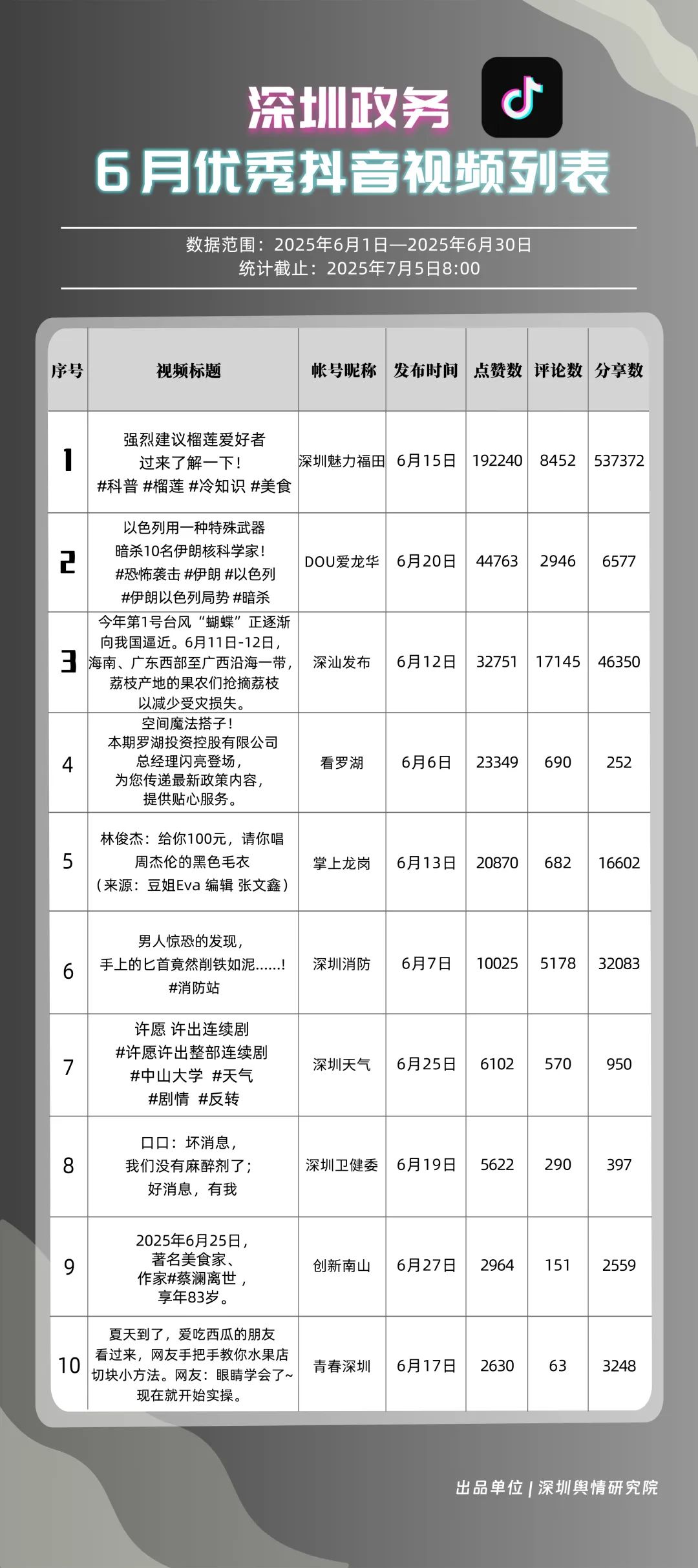6月,“深圳魅力福田”“DOU愛龍華”“深汕發(fā)布”“掌上龍崗”“深圳天氣”“深圳消防”“創(chuàng)新南山”“青春深圳”“深圳交警”“看羅湖”共10個政務(wù)抖音號獲得“優(yōu)秀政務(wù)抖音號”稱號。6月,“深圳魅力福田”登頂,憑借其城市人文、社會熱點(diǎn)類主題短視頻,在傳播指數(shù)得分創(chuàng)新高;“DOU愛龍華”“深汕發(fā)布”“掌上龍崗”緊隨其后,通過各類熱點(diǎn)、創(chuàng)意內(nèi)容提升傳播效能?!吧钲谔鞖狻薄吧钲谙馈币脖憩F(xiàn)突出,短視頻內(nèi)容兼具“信息傳遞”與“情感共鳴”,用戶參與度持續(xù)提升,不斷為網(wǎng)民傳播有價值的政務(wù)信息資訊。
