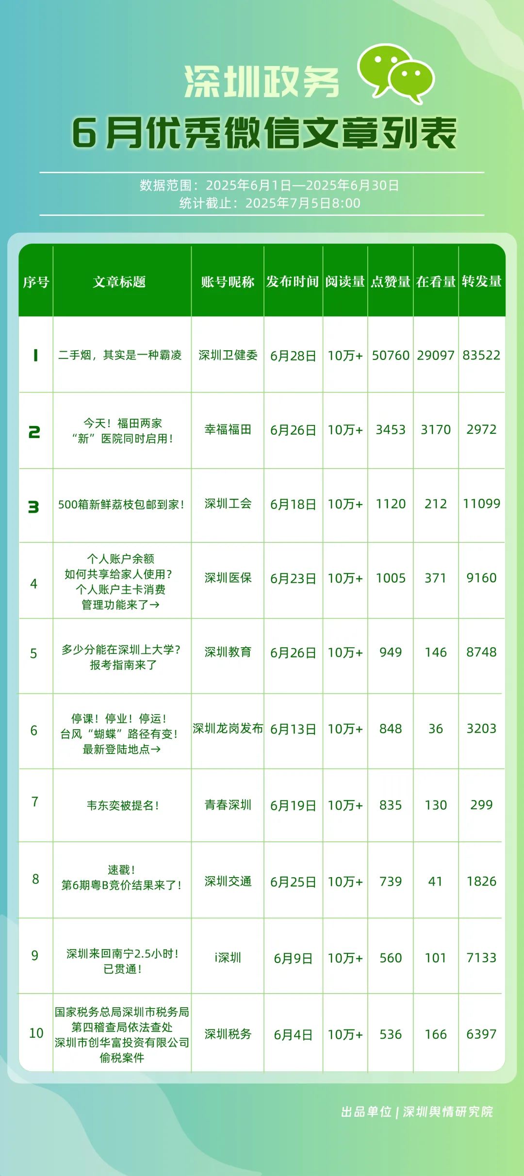 6月,30個政務(wù)微信公眾號入選“深圳優(yōu)秀政務(wù)微信公眾號”榜單,其中包括“深圳衛(wèi)健委”“幸福福田”“深圳龍崗發(fā)布”“i深圳”“創(chuàng)新南山”“青春深圳”“深圳光明”“深圳教育”“深圳龍華”“深圳工會”等。6月,榜單前三名的賬號保持穩(wěn)定,且各創(chuàng)作出多篇閱讀量超10萬次的優(yōu)質(zhì)文章,傳播指數(shù)得分均在100分以上。“深圳衛(wèi)健委”持續(xù)位居榜首,內(nèi)容專業(yè)性與傳播力持續(xù)領(lǐng)跑;“幸福福田”以92.94分位居第二,得分較5月有所提高?!吧钲邶垗彴l(fā)布”“i深圳”“創(chuàng)新南山”也積極發(fā)布民生服務(wù)與宣傳活動內(nèi)容,排名靠前。上榜賬號整體呈現(xiàn)“內(nèi)容精品化、服務(wù)場景化”特點(diǎn),持續(xù)優(yōu)化信息供給質(zhì)量,為用戶打造有深度的政務(wù)信息服務(wù)矩陣。