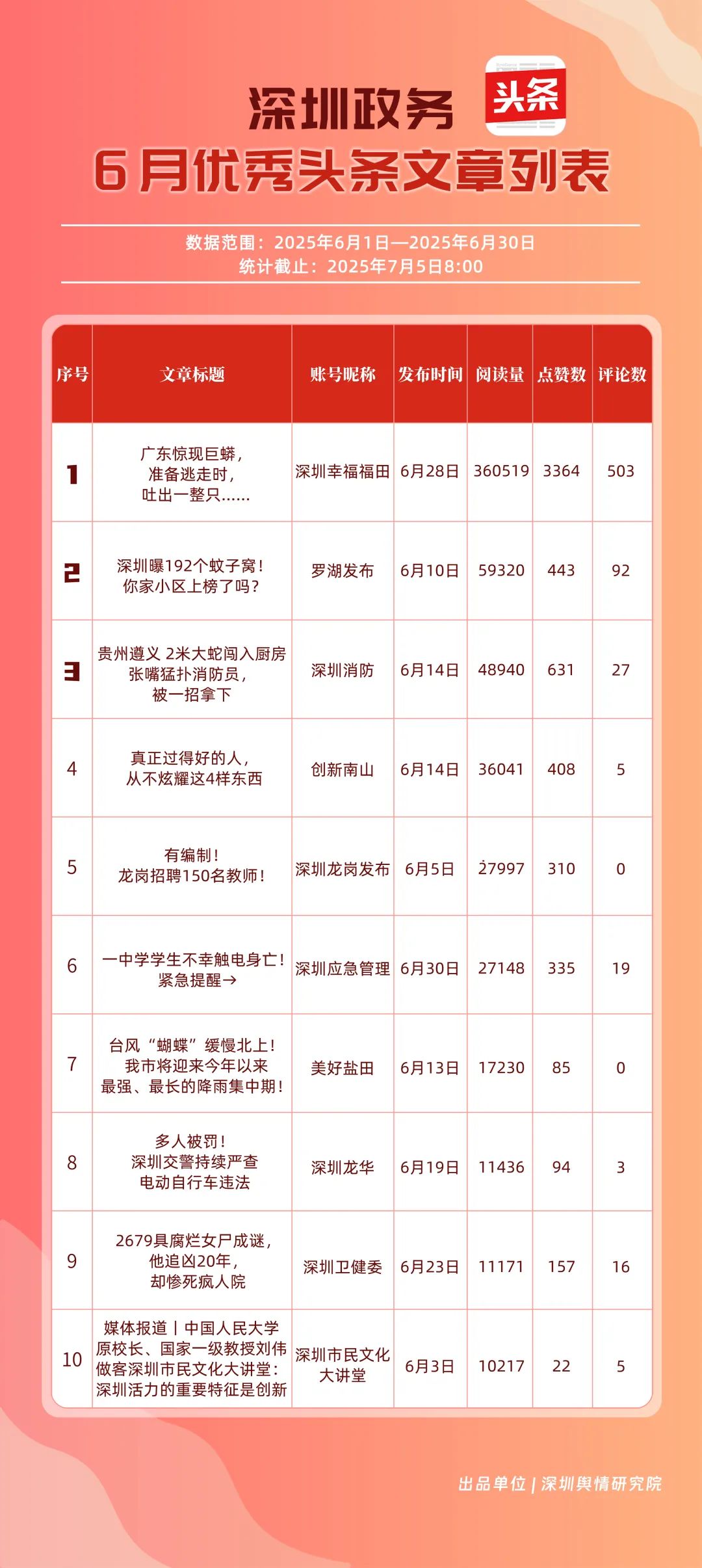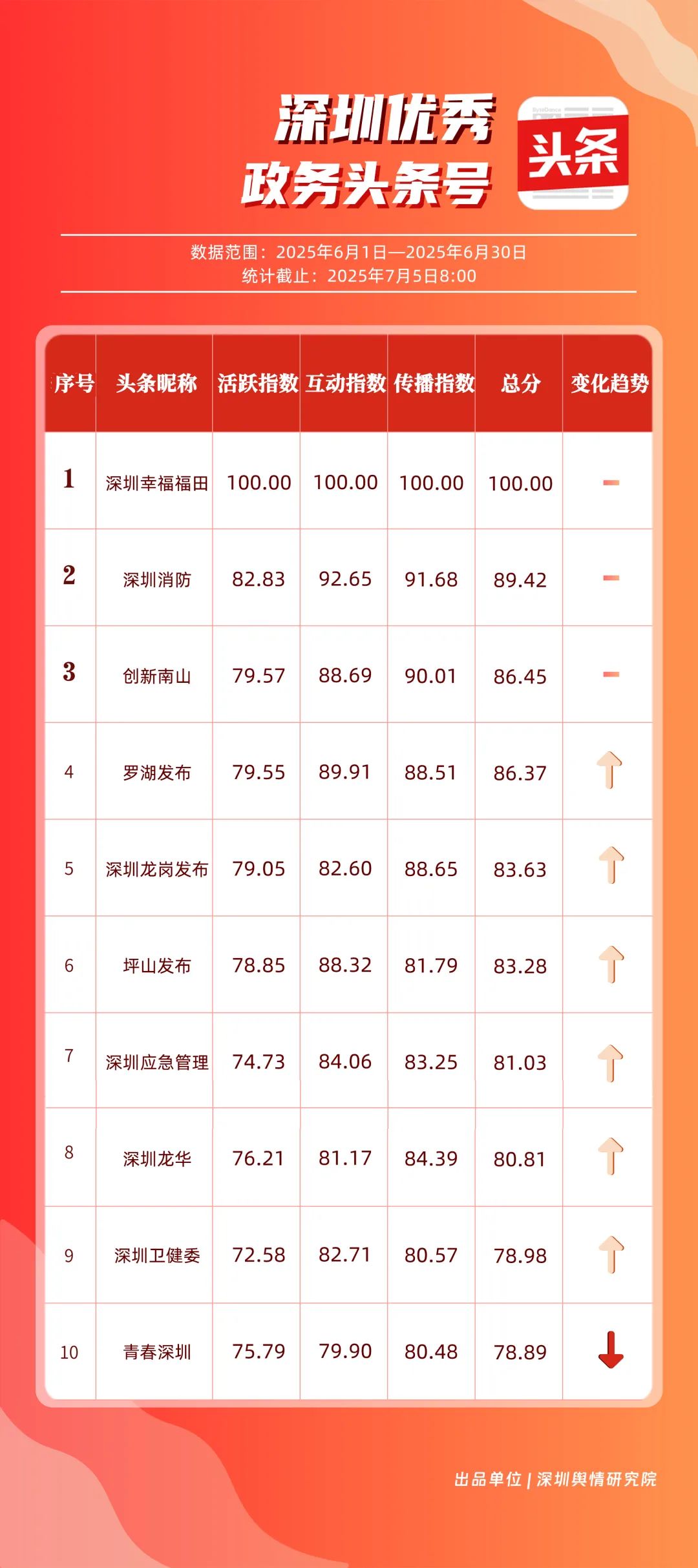 6月,“深圳幸福福田”“深圳消防”“創(chuàng)新南山”“羅湖發(fā)布”“深圳龍崗發(fā)布”“坪山發(fā)布”“深圳應(yīng)急管理”“深圳龍華”“深圳衛(wèi)健委”“青春深圳”共10個政務(wù)頭條號入選“優(yōu)秀政務(wù)頭條號”榜單?!吧钲谛腋8L铩薄吧钲谙馈薄皠?chuàng)新南山”連續(xù)位居榜單前3名,內(nèi)容具備較強(qiáng)的吸引力。“羅湖發(fā)布”“深圳龍崗發(fā)布”排名也在榜單前列,排名較5月有所上升,在區(qū)域形象宣傳與民生服務(wù)中持續(xù)發(fā)力。