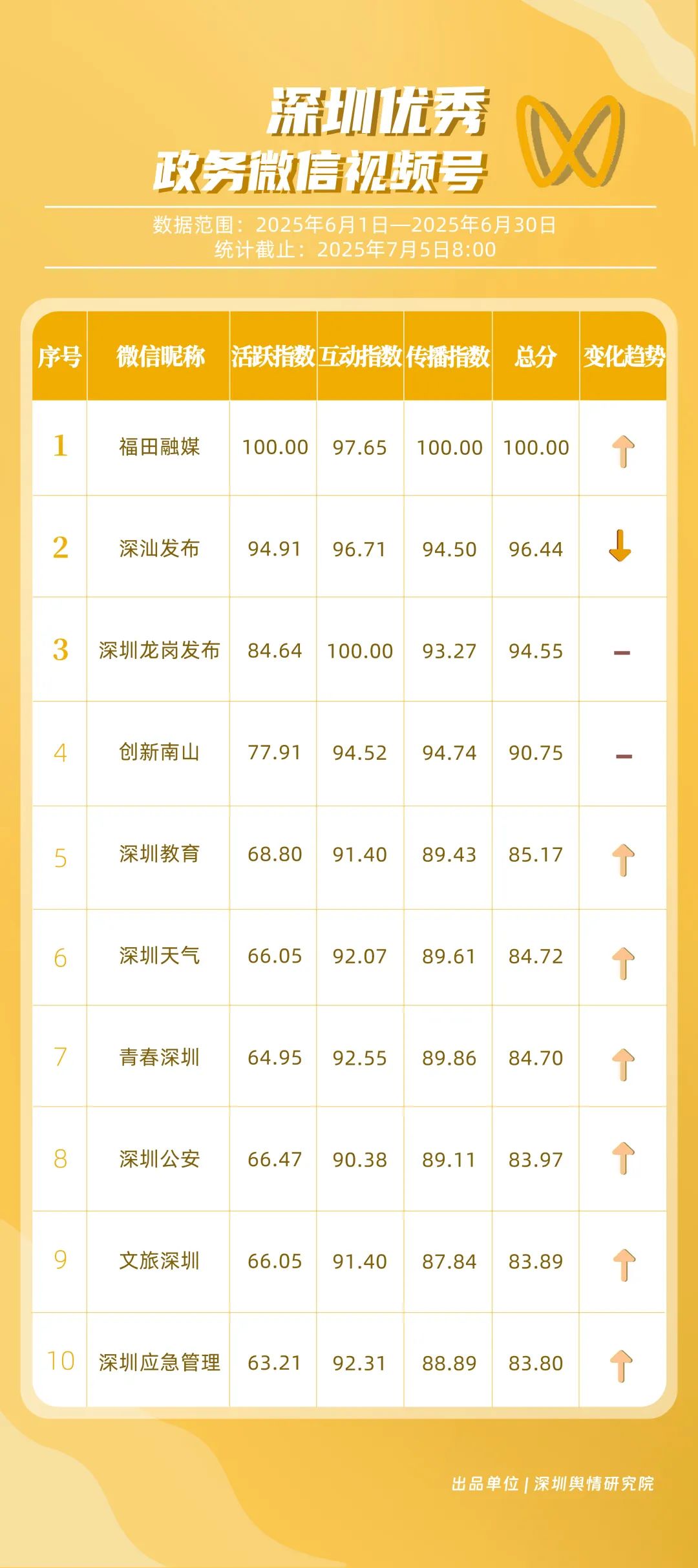 6月,獲得“深圳優(yōu)秀政務(wù)微信視頻號”稱號的是“福田融媒”“深汕發(fā)布”“深圳龍崗發(fā)布”“創(chuàng)新南山”“深圳教育”“深圳天氣”“青春深圳”“深圳公安”“文旅深圳”“深圳應(yīng)急管理”。其中,“福田融媒”以活躍、傳播指數(shù)雙滿分居榜首,其視頻《吃大量荔枝后中毒 警惕“荔枝病”重者可致死》獲得超36萬次轉(zhuǎn)發(fā),成為爆款案例;“深汕發(fā)布”“深圳龍崗發(fā)布”“創(chuàng)新南山”得分在90分以上,在互動、傳播方面表現(xiàn)亮眼。這些優(yōu)秀的政務(wù)微信視頻號以各自的獨(dú)特風(fēng)格持續(xù)發(fā)力,為政務(wù)及民生信息傳遞開拓更鮮活、暢通的路徑。