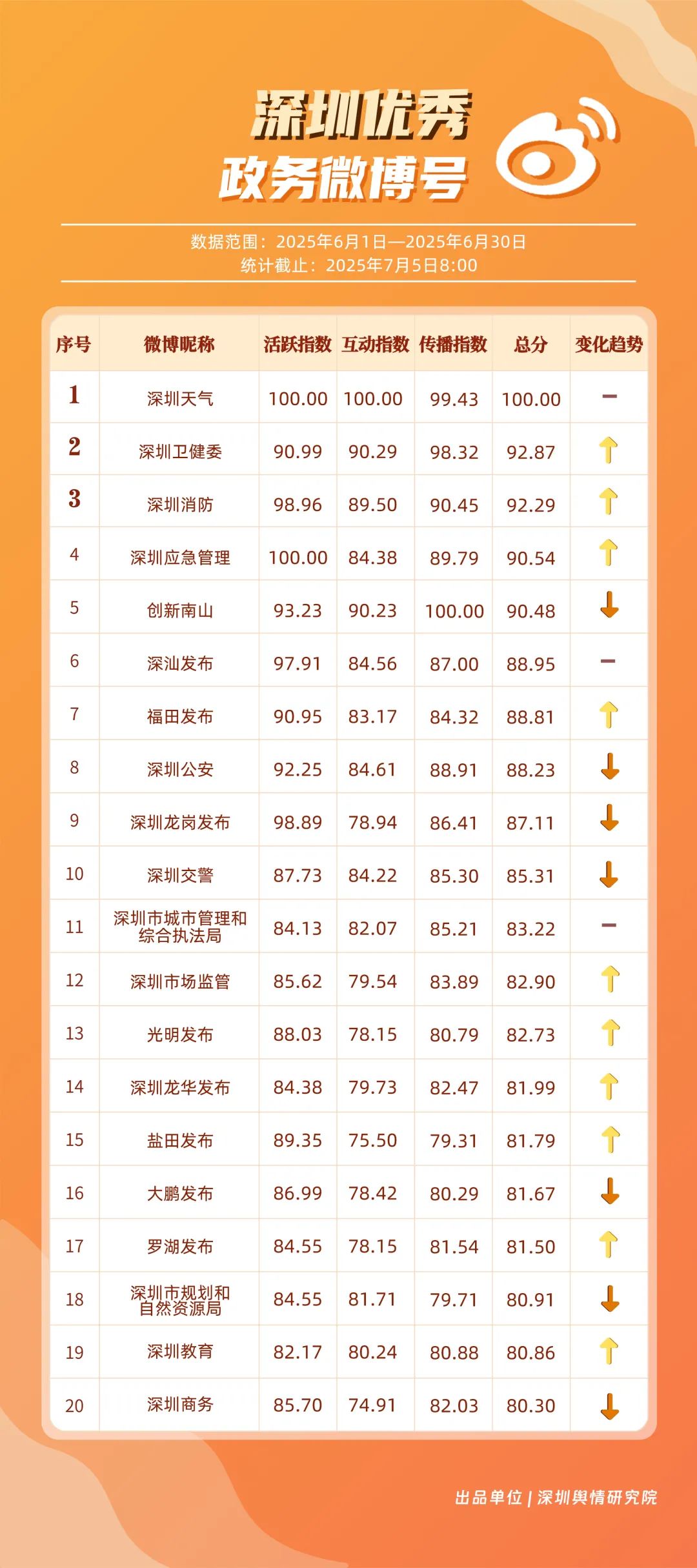 6月,“深圳天氣”“深圳衛(wèi)健委”“深圳消防”“深圳應(yīng)急管理”“創(chuàng)新南山”“深汕發(fā)布”“福田發(fā)布”“深圳公安”“深圳龍崗發(fā)布”“深圳交警”等20個賬號入選“優(yōu)秀政務(wù)微博號”。其中,“深圳天氣”以活躍、互動指數(shù)雙滿分穩(wěn)居第一,氣象服務(wù)信息及時性與科普內(nèi)容趣味性獲市民高度認(rèn)可;“深圳衛(wèi)健委”“深圳消防”“深圳應(yīng)急管理”分別位列2至4位,通過熱點(diǎn)話題聯(lián)動醫(yī)療、消防、應(yīng)急知識科普擴(kuò)大影響力,政務(wù)微博矩陣在突發(fā)事件響應(yīng)與民生服務(wù)中作用凸顯。