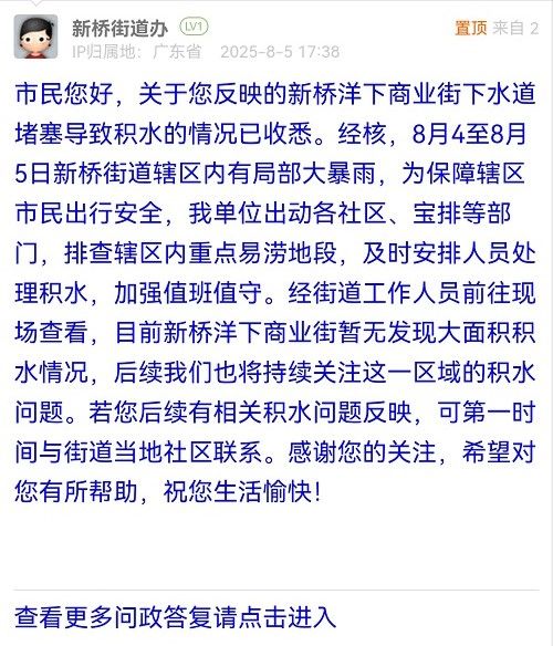 市民您好,關(guān)于您反映的新橋洋下商業(yè)街下水道堵塞導(dǎo)致積水的情況已收悉。經(jīng)核,8月4至8月5日新橋街道轄區(qū)內(nèi)有局部大暴雨,為保障轄區(qū)市民出行安全,我單位出動(dòng)各社區(qū)、寶排等部門,排查轄區(qū)內(nèi)重點(diǎn)易澇地段,及時(shí)安排人員處理積水,加強(qiáng)值班值守。經(jīng)街道工作人員前往現(xiàn)場(chǎng)查看,目前新橋洋下商業(yè)街暫無發(fā)現(xiàn)大面積積水情況,后續(xù)我們也將持續(xù)關(guān)注這一區(qū)域的積水問題。若您后續(xù)有相關(guān)積水問題反映,可第一時(shí)間與街道當(dāng)?shù)厣鐓^(qū)聯(lián)系。感謝您的關(guān)注,希望對(duì)您有所幫助,祝您生活愉快!