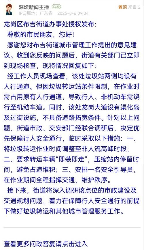 經(jīng)工作人員現(xiàn)場(chǎng)查看,該處垃圾站兩側(cè)均設(shè)有人行通道。但因垃圾轉(zhuǎn)運(yùn)站條件限制,在作業(yè)時(shí)需占用原有人行通道,導(dǎo)致行人、非機(jī)動(dòng)車需繞行至機(jī)動(dòng)車道。同時(shí),該處龍崗大道設(shè)有渠化島及過街設(shè)施,不具備道路拓寬條件。針對(duì)以上問題,街道市政、交安部門經(jīng)聯(lián)合調(diào)研后,決定優(yōu)先保障行人安全通行,臨時(shí)采取以下措施:一、將垃圾轉(zhuǎn)運(yùn)作業(yè)時(shí)間調(diào)整至非人流高峰時(shí)段;二、要求轉(zhuǎn)運(yùn)車輛“即裝即走”,壓縮站內(nèi)停留時(shí)間,避免占道堆積;三、安排一名安全引導(dǎo)員,在作業(yè)期間全程指揮交通、維護(hù)秩序。