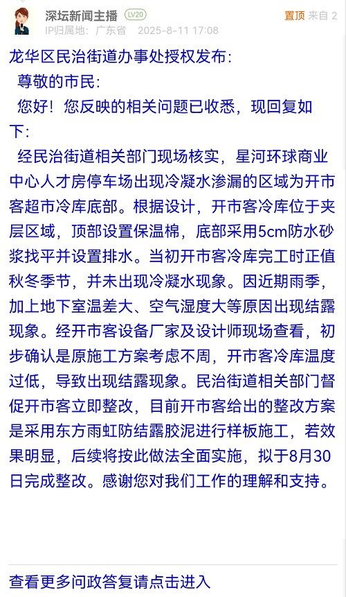 經(jīng)民治街道相關(guān)部門現(xiàn)場(chǎng)核實(shí),星河環(huán)球商業(yè)中心人才房停車場(chǎng)出現(xiàn)冷凝水滲漏的區(qū)域?yàn)殚_市客超市冷庫底部。根據(jù)設(shè)計(jì),開市客冷庫位于夾層區(qū)域,頂部設(shè)置保溫棉,底部采用5cm防水砂漿找平并設(shè)置排水。當(dāng)初開市客冷庫完工時(shí)正值秋冬季節(jié),并未出現(xiàn)冷凝水現(xiàn)象。因近期雨季,加上地下室溫差大、空氣濕度大等原因出現(xiàn)結(jié)露現(xiàn)象。經(jīng)開市客設(shè)備廠家及設(shè)計(jì)師現(xiàn)場(chǎng)查看,初步確認(rèn)是原施工方案考慮不周,開市客冷庫溫度過低,導(dǎo)致出現(xiàn)結(jié)露現(xiàn)象。民治街道相關(guān)部門督促開市客立即整改,目前開市客給出的整改方案是采用東方雨虹防結(jié)露膠泥進(jìn)行樣板施工,若效果明顯,后續(xù)將按此做法全面實(shí)施,擬于8月30日完成整改。感謝您對(duì)我們工作的理解和支持。