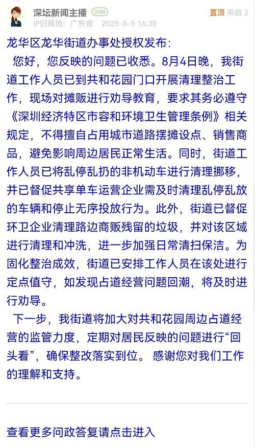下一步,我街道將加大對(duì)共和花園周邊占道經(jīng)營的監(jiān)管力度,定期對(duì)居民反映的問題進(jìn)行“回頭看”,確保整改落實(shí)到位。 感謝您對(duì)我們工作的理解和支持。