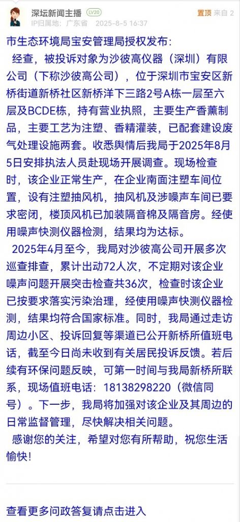 經(jīng)查,被投訴對(duì)象為沙彼高儀器(深圳)有限公司(下稱沙彼高公司),位于深圳市寶安區(qū)新橋街道新橋社區(qū)新橋洋下三路2號(hào)A棟一層至六層及BCDE棟,持有營業(yè)執(zhí)照,主要生產(chǎn)香薰制品,主要工藝為注塑、香精灌裝,已配套建設(shè)廢氣處理設(shè)施兩套。收悉輿情后我局于2025年8月5日安排執(zhí)法人員赴現(xiàn)場(chǎng)開展調(diào)查。現(xiàn)場(chǎng)檢查時(shí),該企業(yè)正常生產(chǎn),在企業(yè)南面注塑車間位置,設(shè)有注塑抽風(fēng)機(jī),抽風(fēng)機(jī)及涉噪聲車間已要求密閉,樓頂風(fēng)機(jī)已加裝隔音棉及隔音房。經(jīng)使用噪聲快測(cè)儀器檢測(cè),結(jié)果均為達(dá)標(biāo)。