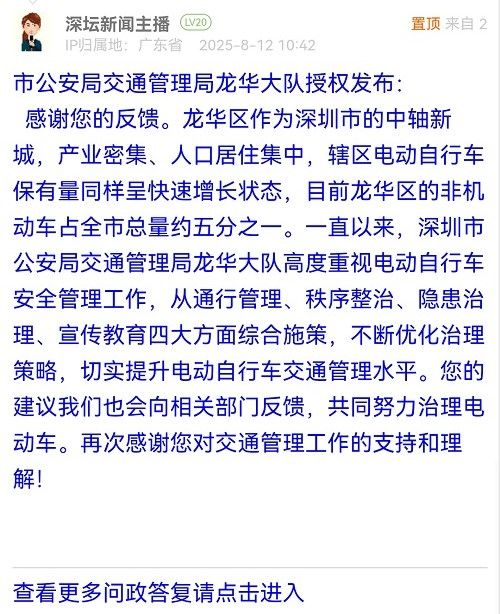 感謝您的反饋。龍華區(qū)作為深圳市的中軸新城,產(chǎn)業(yè)密集、人口居住集中,轄區(qū)電動(dòng)自行車保有量同樣呈快速增長狀態(tài),目前龍華區(qū)的非機(jī)動(dòng)車占全市總量約五分之一。一直以來,深圳市公安局交通管理局龍華大隊(duì)高度重視電動(dòng)自行車安全管理工作,從通行管理、秩序整治、隱患治理、宣傳教育四大方面綜合施策,不斷優(yōu)化治理策略,切實(shí)提升電動(dòng)自行車交通管理水平。您的建議我們也會(huì)向相關(guān)部門反饋,共同努力治理電動(dòng)車。再次感謝您對(duì)交通管理工作的支持和理解!