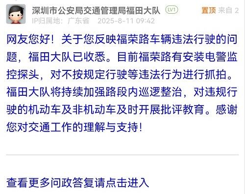 網(wǎng)友您好!關(guān)于您反映福榮路車輛違法行駛的問題,福田大隊(duì)已收悉。目前福榮路有安裝電警監(jiān)控探頭,對(duì)不按規(guī)定行駛等違法行為進(jìn)行抓拍。福田大隊(duì)將持續(xù)加強(qiáng)路段內(nèi)巡邏整治,對(duì)違規(guī)行駛的機(jī)動(dòng)車及非機(jī)動(dòng)車及時(shí)開展批評(píng)教育。感謝您對(duì)交通工作的理解與支持!
