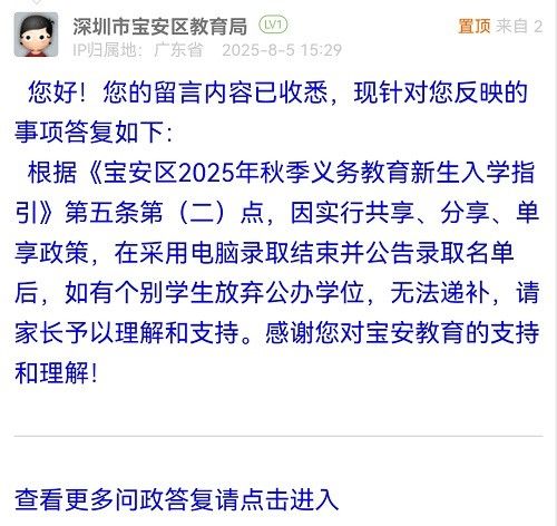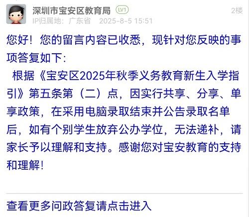 根據(jù)《寶安區(qū)2025年秋季義務(wù)教育新生入學(xué)指引》第五條第(二)點(diǎn),因?qū)嵭泄蚕?、分享、單享政策,在采用電腦錄取結(jié)束并公告錄取名單后,如有個(gè)別學(xué)生放棄公辦學(xué)位,無法遞補(bǔ),請(qǐng)家長予以理解和支持。感謝您對(duì)寶安教育的支持和理解!