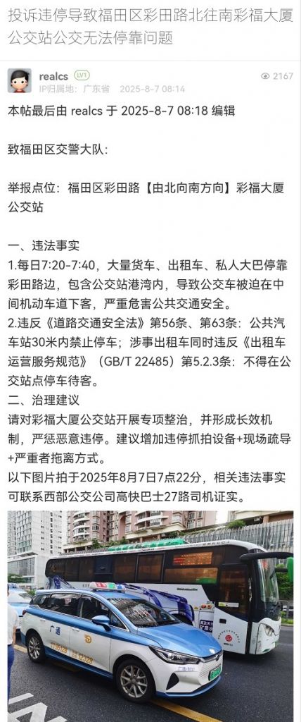 16. 帖文《投訴違停導(dǎo)致福田區(qū)彩田路北往南彩福大廈公交站公交無法??繂栴}》
