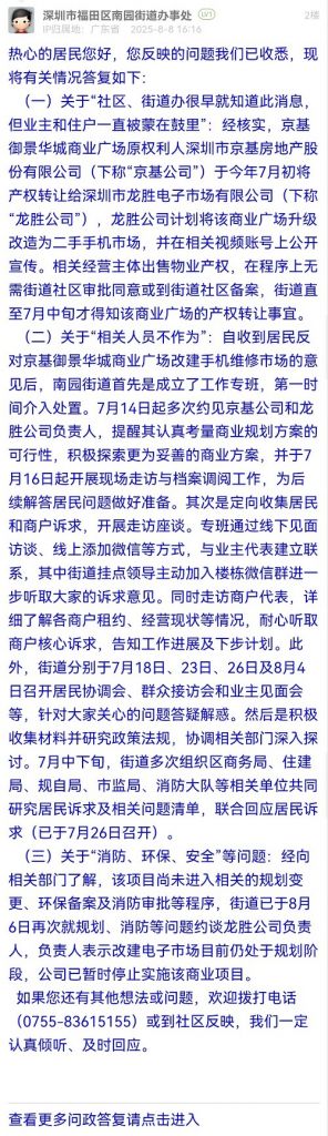 (二)關(guān)于“相關(guān)人員不作為”:自收到居民反對(duì)京基御景華城商業(yè)廣場(chǎng)改建手機(jī)維修市場(chǎng)的意見后,南園街道首先是成立了工作專班,第一時(shí)間介入處置。7月14日起多次約見京基公司和龍勝公司負(fù)責(zé)人,提醒其認(rèn)真考量商業(yè)規(guī)劃方案的可行性,積極探索更為妥善的商業(yè)方案,并于7月16日起開展現(xiàn)場(chǎng)走訪與檔案調(diào)閱工作,為后續(xù)解答居民問題做好準(zhǔn)備。其次是定向收集居民和商戶訴求,開展走訪座談。專班通過線下見面訪談、線上添加微信等方式,與業(yè)主代表建立聯(lián)系,其中街道掛點(diǎn)領(lǐng)導(dǎo)主動(dòng)加入樓棟微信群進(jìn)一步聽取大家的訴求意見。同時(shí)走訪商戶代表,詳細(xì)了解各商戶租約、經(jīng)營現(xiàn)狀等情況,耐心聽取商戶核心訴求,告知工作進(jìn)展及下步計(jì)劃。此外,街道分別于7月18日、23日、26日及8月4日召開居民協(xié)調(diào)會(huì)、群眾接訪會(huì)和業(yè)主見面會(huì)等,針對(duì)大家關(guān)心的問題答疑解惑。然后是積極收集材料并研究政策法規(guī),協(xié)調(diào)相關(guān)部門深入探討。7月中下旬,街道多次組織區(qū)商務(wù)局、住建局、規(guī)自局、市監(jiān)局、消防大隊(duì)等相關(guān)單位共同研究居民訴求及相關(guān)問題清單,聯(lián)合回應(yīng)居民訴求(已于7月26日召開)。
