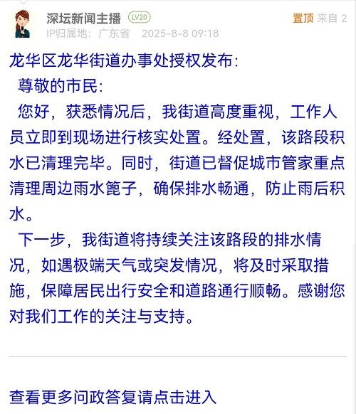 您好,獲悉情況后,我街道高度重視,工作人員立即到現(xiàn)場(chǎng)進(jìn)行核實(shí)處置。經(jīng)處置,該路段積水已清理完畢。同時(shí),街道已督促城市管家重點(diǎn)清理周邊雨水篦子,確保排水暢通,防止雨后積水。