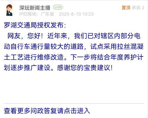 網(wǎng)友,您好!近年來,我們已對(duì)轄區(qū)內(nèi)部分電動(dòng)自行車通行量較大的道路,試點(diǎn)采用拉絲混凝土工藝進(jìn)行維修改造。下一步將結(jié)合年度養(yǎng)護(hù)計(jì)劃逐步推廣建設(shè)。感謝您的寶貴建議!