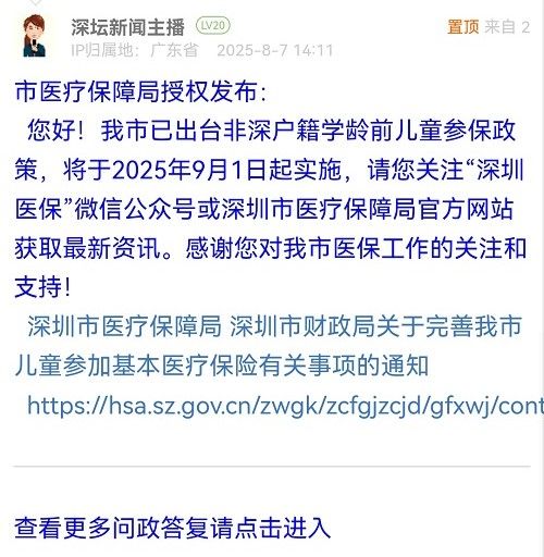 您好!我市已出臺(tái)非深戶籍學(xué)齡前兒童參保政策,將于2025年9月1日起實(shí)施,請(qǐng)您關(guān)注“深圳醫(yī)?!蔽⑿殴娞?hào)或深圳市醫(yī)療保障局官方網(wǎng)站獲取最新資訊。感謝您對(duì)我市醫(yī)保工作的關(guān)注和支持!