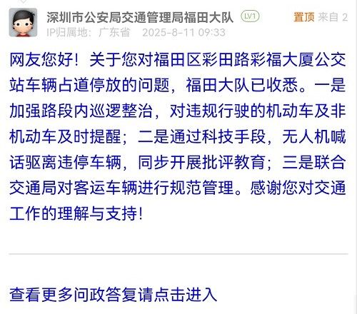網(wǎng)友您好!關(guān)于您對(duì)福田區(qū)彩田路彩福大廈公交站車輛占道停放的問題,福田大隊(duì)已收悉。一是加強(qiáng)路段內(nèi)巡邏整治,對(duì)違規(guī)行駛的機(jī)動(dòng)車及非機(jī)動(dòng)車及時(shí)提醒;二是通過科技手段,無人機(jī)喊話驅(qū)離違停車輛,同步開展批評(píng)教育;三是聯(lián)合交通局對(duì)客運(yùn)車輛進(jìn)行規(guī)范管理。感謝您對(duì)交通工作的理解與支持!