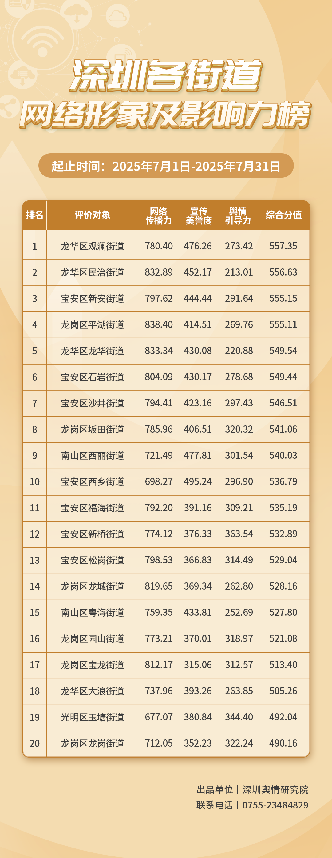 7月,各街道主動挖掘社交平臺的傳播特點,完善基層治理模式。《深圳各街道網(wǎng)絡形象及影響力榜》(7月榜單)起,榜單各指標占比優(yōu)化,在計算綜合分值時,將網(wǎng)絡傳播力、宣傳美譽度、輿情引導力三項指標的占比,調整為40%、40%、20%,以便更好地觀察與評估各街道在網(wǎng)絡空間的展現(xiàn)及其影響力。本次榜單的數(shù)據(jù)統(tǒng)計時間跨度為2025年7月1日至7月31日。