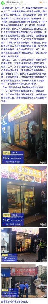 經(jīng)查,您所反映的店鋪位于粵海新村7棟一樓小區(qū)內(nèi)的“阿健烤鮮牛肉”。2025年8月1日收到相關(guān)線索后,我隊(duì)工作人員立即趕赴現(xiàn)場(chǎng)核實(shí)。當(dāng)日未發(fā)現(xiàn)該店將燒烤車擺放門口經(jīng)營的情況。工作人員已現(xiàn)場(chǎng)向該店經(jīng)營人員普法,強(qiáng)調(diào)根據(jù)相關(guān)規(guī)定,任何單位和個(gè)人不得擅自占用城市道路、廣場(chǎng)等公共場(chǎng)所堆放物料、占道經(jīng)營。并督促該店經(jīng)營人員盡快加裝油煙凈化器,減少對(duì)周邊居民的影響,切實(shí)維護(hù)鄰里和諧。8月14日,我隊(duì)檢查該店油煙凈化器安裝情況,確認(rèn)其已安裝完畢并投入使用。