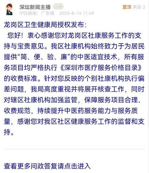 您好!衷心感謝您對(duì)龍崗區(qū)社康服務(wù)工作的支持與寶貴意見。我區(qū)社康機(jī)構(gòu)始終致力于為居民提供“簡(jiǎn)、便、驗(yàn)、廉”的中醫(yī)適宜技術(shù),所有服務(wù)項(xiàng)目均嚴(yán)格執(zhí)行《深圳市醫(yī)療服務(wù)價(jià)格目錄》的收費(fèi)標(biāo)準(zhǔn)。針對(duì)您反映的個(gè)別社康機(jī)構(gòu)執(zhí)行偏差問題,我局高度重視并將展開核查工作,同時(shí)對(duì)轄區(qū)社康機(jī)構(gòu)加強(qiáng)監(jiān)管,保障服務(wù)項(xiàng)目合理、收費(fèi)規(guī)范,持續(xù)提升中醫(yī)藥服務(wù)能力與服務(wù)質(zhì)量,感謝您對(duì)我區(qū)社區(qū)健康服務(wù)工作的監(jiān)督和支持。