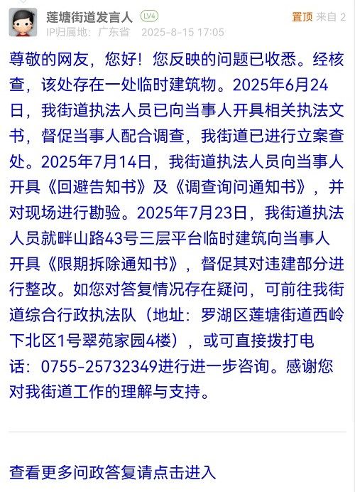 15. 帖文《投訴羅湖區(qū)蓮塘街道畔山路43號(hào)長(zhǎng)期明顯違建?。ㄆ撸?/a>》