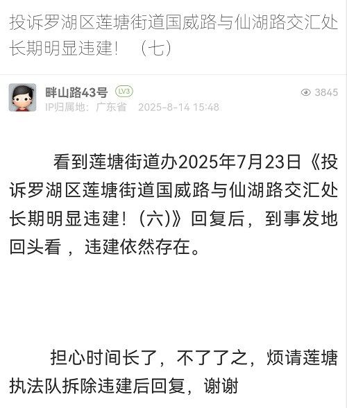 16. 帖文《投訴羅湖區(qū)蓮塘街道國威路與仙湖路交匯處長(zhǎng)期明顯違建!(七)》