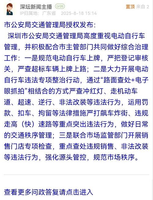 深圳市公安局交通管理局高度重視電動(dòng)自行車管理,并積極配合市主管部門共同做好綜合治理工作:一是規(guī)范電動(dòng)自行車上牌,嚴(yán)把登記審核關(guān),嚴(yán)查超標(biāo)車輛上牌上路;二是大力開展電動(dòng)自行車違法專項(xiàng)整治行動(dòng),通過“路面查處+電子眼抓拍”相結(jié)合的方式嚴(yán)查沖紅燈、走機(jī)動(dòng)車道、超速、逆行、非法改裝等違法行為,運(yùn)用罰款、扣車、拘留等法律措施嚴(yán)打飆車炸街、違規(guī)走高(快)速路等重點(diǎn)突出違法行為,做好日常的交通秩序管理;三是聯(lián)合市場(chǎng)監(jiān)管部門開展銷售門店專項(xiàng)檢查,重點(diǎn)查處違規(guī)銷售、非法改裝等違法行為,強(qiáng)化源頭管控,規(guī)范市場(chǎng)秩序。