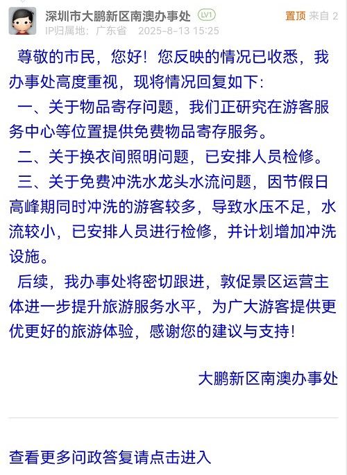 三、關(guān)于免費(fèi)沖洗水龍頭水流問題,因節(jié)假日高峰期同時(shí)沖洗的游客較多,導(dǎo)致水壓不足,水流較小,已安排人員進(jìn)行檢修,并計(jì)劃增加沖洗設(shè)施。