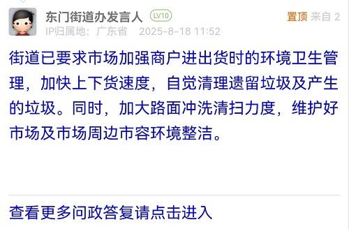 街道已要求市場(chǎng)加強(qiáng)商戶進(jìn)出貨時(shí)的環(huán)境衛(wèi)生管理,加快上下貨速度,自覺清理遺留垃圾及產(chǎn)生的垃圾。同時(shí),加大路面沖洗清掃力度,維護(hù)好市場(chǎng)及市場(chǎng)周邊市容環(huán)境整潔。