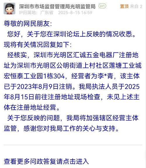 尊敬的網(wǎng)民朋友:您好,關(guān)于您在深圳論壇上反映的情況收悉?,F(xiàn)將有關(guān)情況回復(fù)如下:經(jīng)核實(shí),深圳市光明區(qū)匯誠五金電器廠注冊(cè)地址為深圳市光明區(qū)公明街道上村社區(qū)蓮塘工業(yè)城宏恒泰工業(yè)園1棟304,經(jīng)營者為李*青,該主體已于2023年8月9日注銷。我局執(zhí)法人員于2025年8月15日前往注冊(cè)地址現(xiàn)場(chǎng)檢查,未見上述主體在注冊(cè)地址經(jīng)營。關(guān)于您反映的問題,我局將加強(qiáng)轄區(qū)經(jīng)營主體監(jiān)管,感謝您對(duì)我局工作的關(guān)心與支持。
