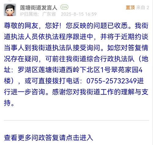尊敬的網(wǎng)友,您好!您反映的問題已收悉。我街道執(zhí)法人員依執(zhí)法程序跟進(jìn)中,并將于近期約談當(dāng)事人到我街道執(zhí)法隊(duì)接受詢問。如您對(duì)答復(fù)情況存在疑問,可前往我街道綜合行政執(zhí)法隊(duì)(地址:羅湖區(qū)蓮塘街道西嶺下北區(qū)1號(hào)翠苑家園4樓),或可直接撥打電話:0755-25732349進(jìn)行進(jìn)一步咨詢。感謝您對(duì)我街道工作的理解與支持。